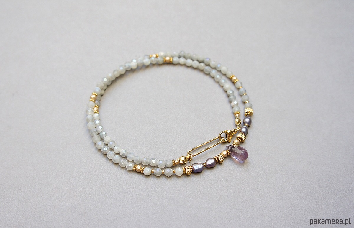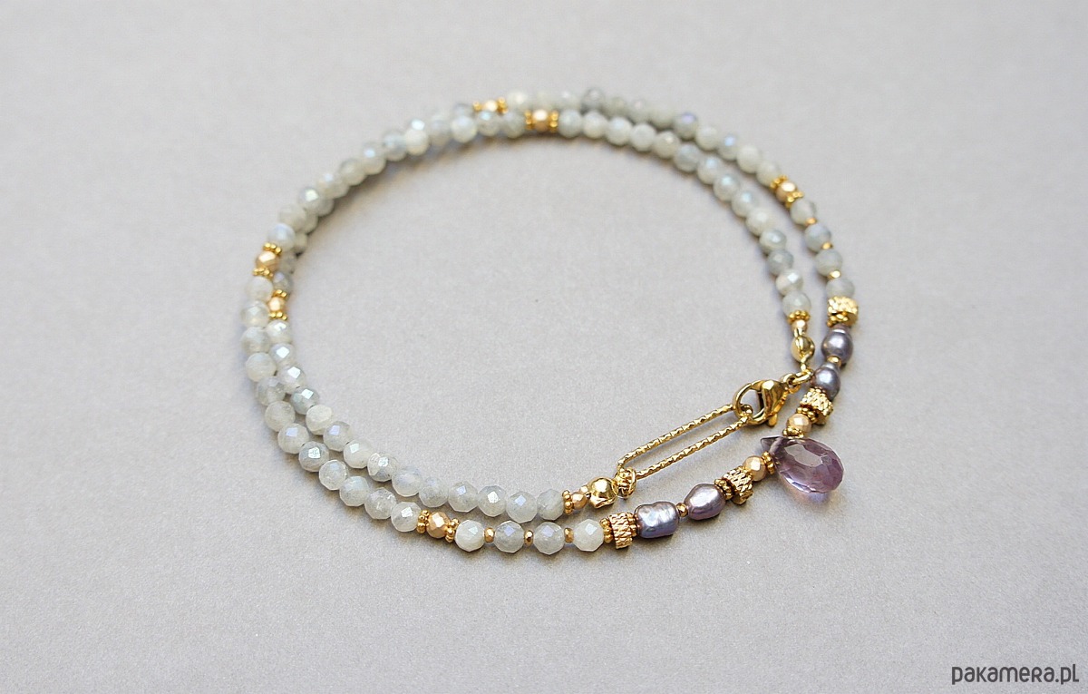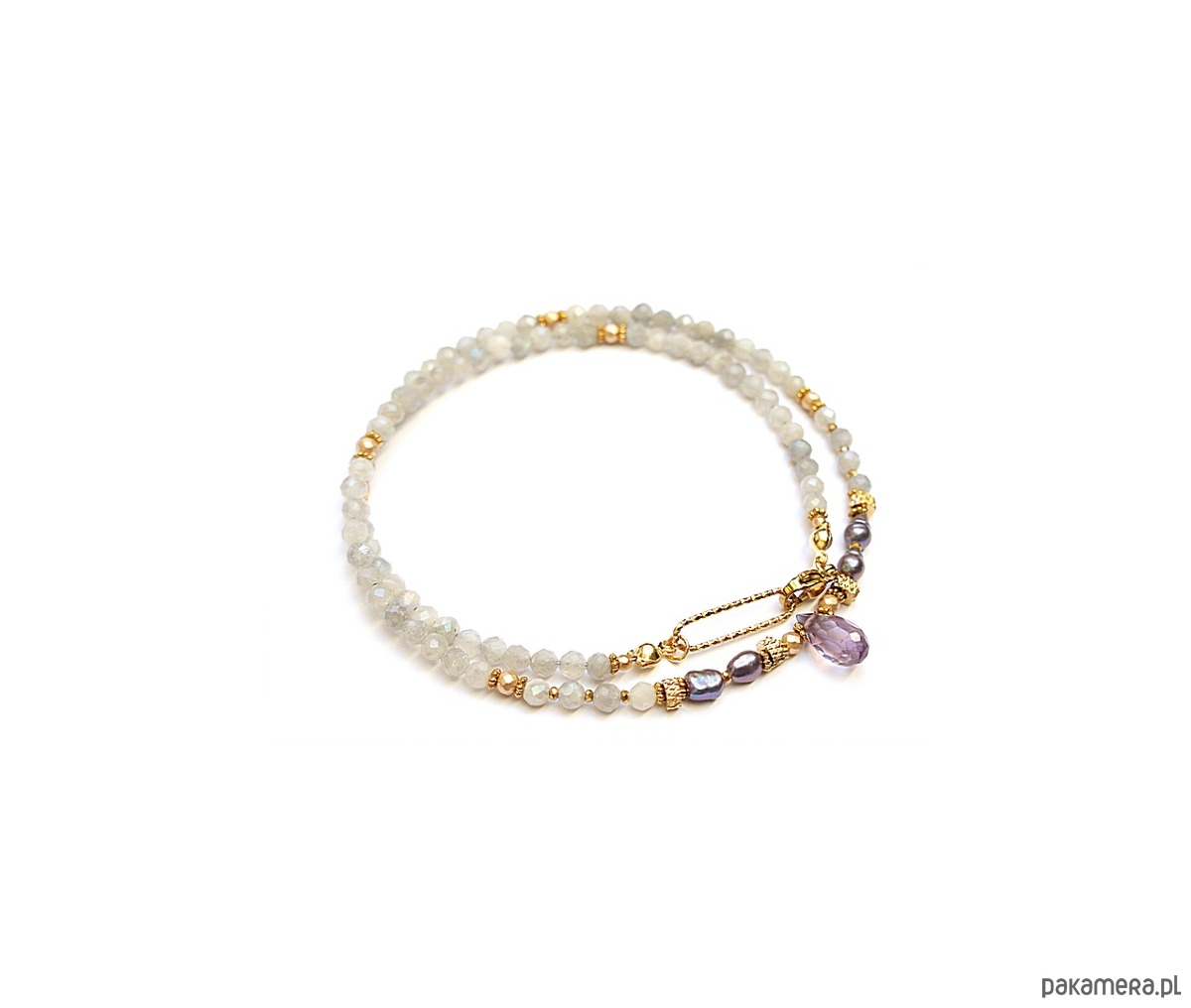 Krótki, delikatny naszyjnik wykonany w całości z pozłacanej stali szlachetnej oraz naturalnych, szlachetnych kamieni - labradorytów fasetowanych [4mm], pereł słodkowodnych w fioletowym kolorze [ok. 5-6mm], hematytu fasetowanego, platerowanego [3mm], przekładek z hematytu [1mm] oraz brioletki ametrynu. Naszyjnik o długości ok. 45cm. Biżuteria ozdobnie zapakowana.