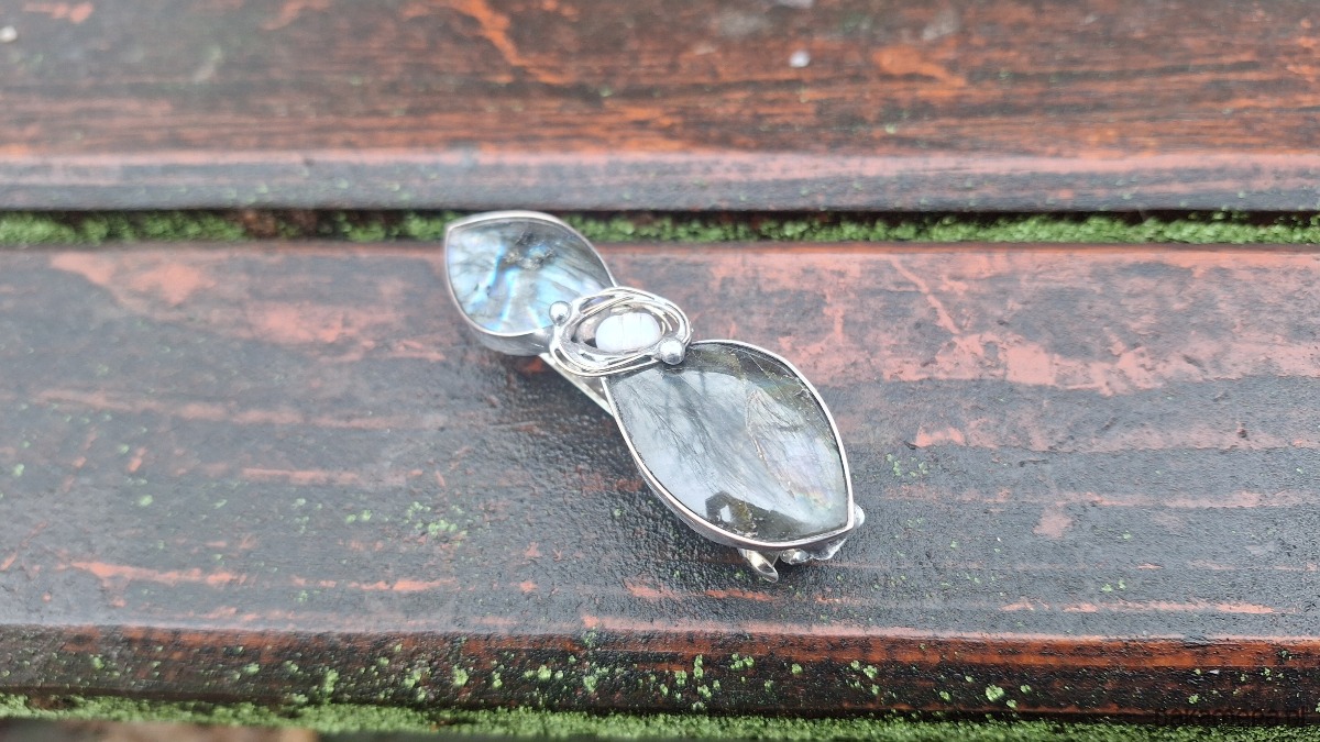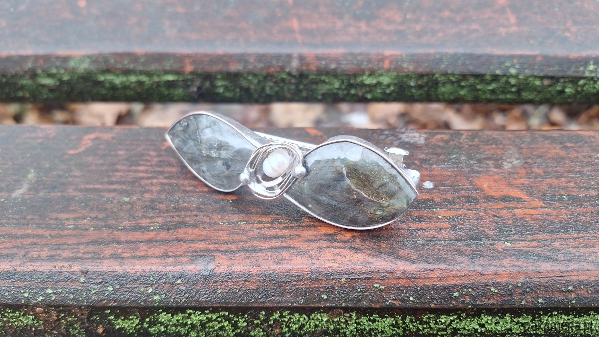 Klamra do włosów, wykonana z miedzi, cyny, perły i labradorytów. Wymiary ok. 8 na 2.5 cm. Zapięcie 6 cm, metalowe.