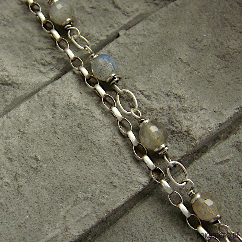 Delikatna, kobieca i wyjątkowa bransoletka na co dzień i nie tylko. Wykonana w całości z oksydowanego srebra próby 925 oraz fasetowanych kulek labradorytu wielkości ok. 5-5,5 mm. Przy zapieciu zawieszka w ksztalcie czterolistnej koniczyny. Całkowita długość bransoletki regulowana od 19 cm do 21 cm. Ozdobnie zapakowana.