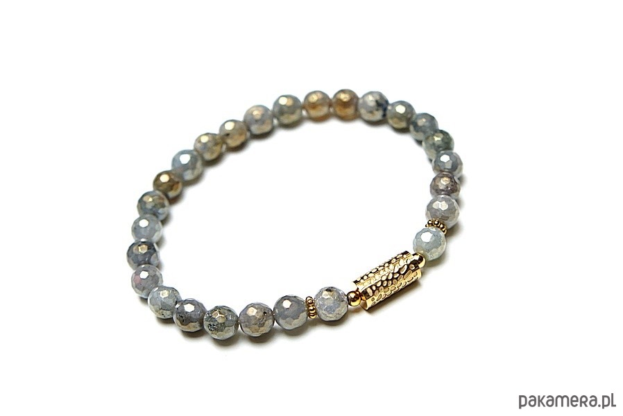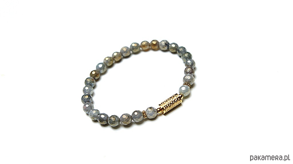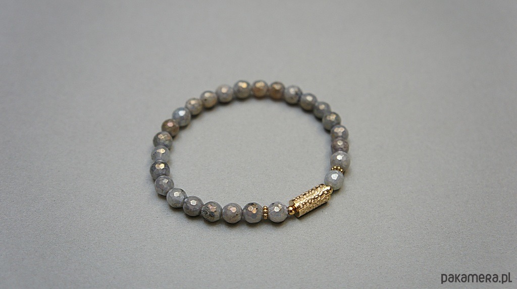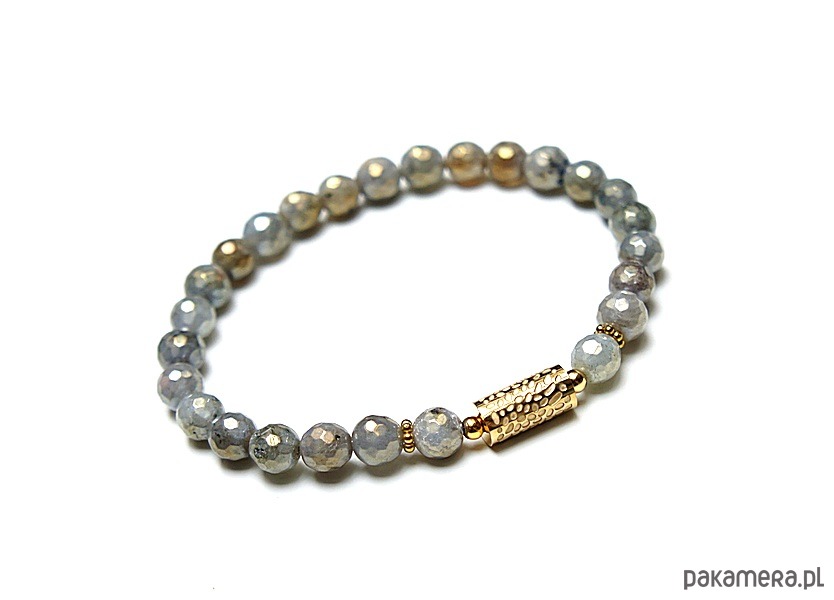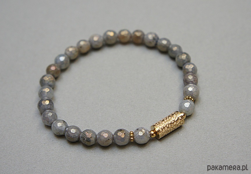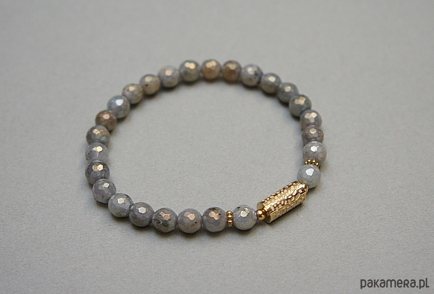 Delikatna bransoletka wykonana w całości ze stali szlachetnej pozłacanej, szlachetnych kamieni - unikatowy labradoryt fasetowany, platerowany z perłową poświatą [6mm]. Pasuje na nadgarstek 16-17cm . Bransoletka na gumce silikonowej. Biżuteria ozdobnie zapakowana.