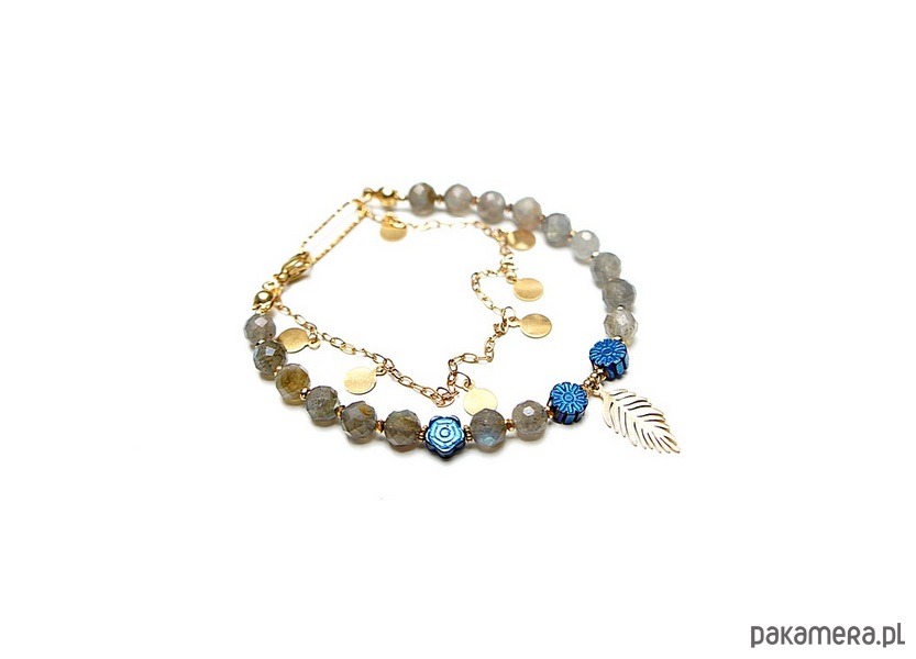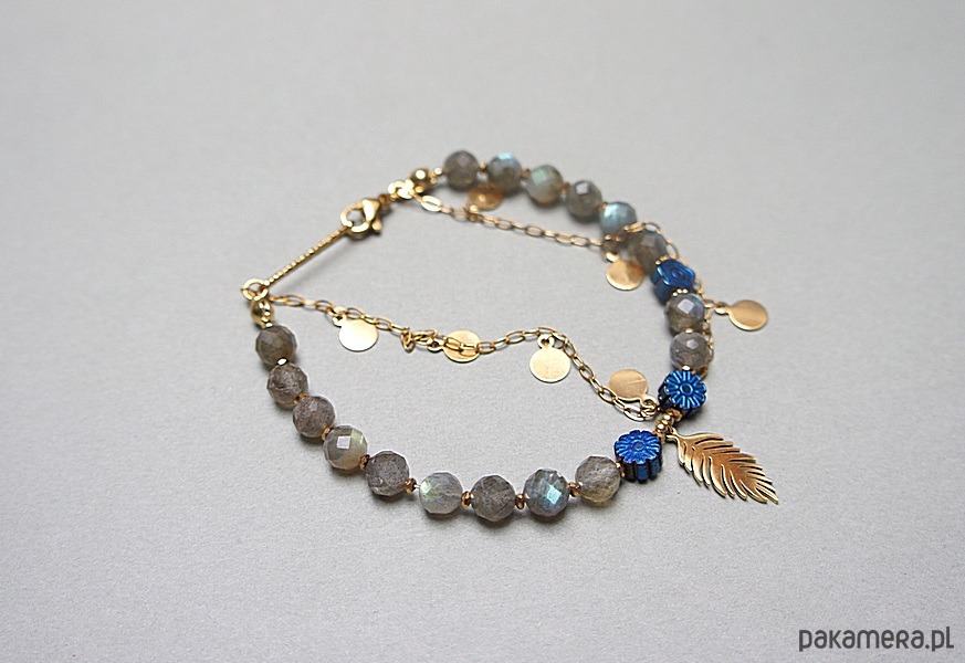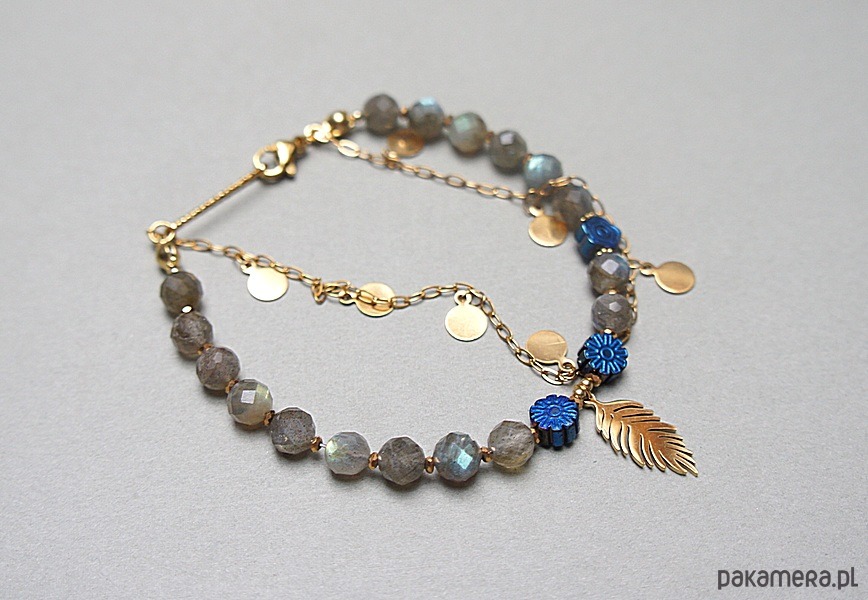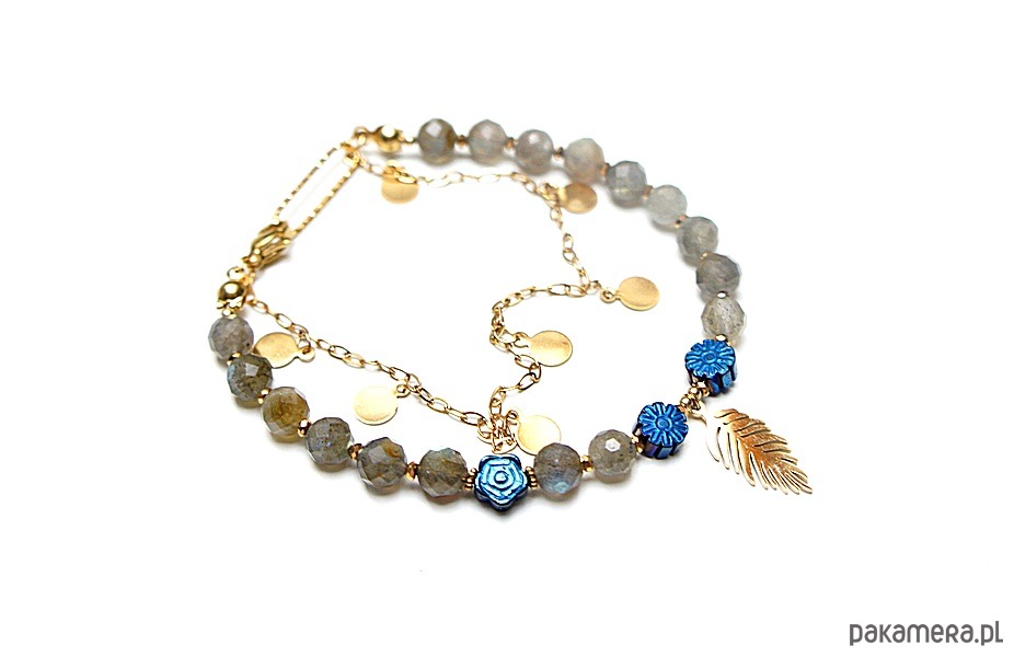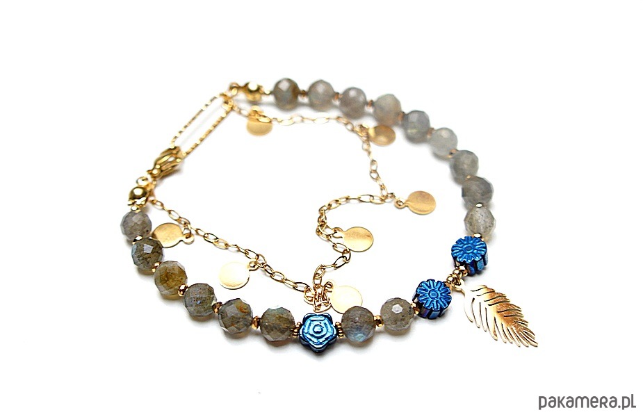 Delikatna bransoletka wykonana w całości ze stali szlachetnej pozłacanej oraz naturalnych, szlachetnych kamieni - fasetowanych labradorytów o dużym stopniu labradoryzacji [6mm], kwiatków z hematytu [6mm], przekładek z hematytu [1mm]. Całkowita długość bransoletki 20cm.