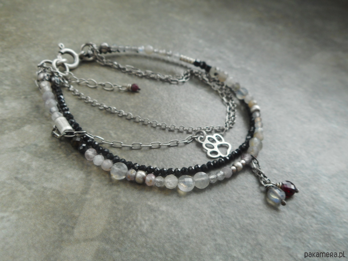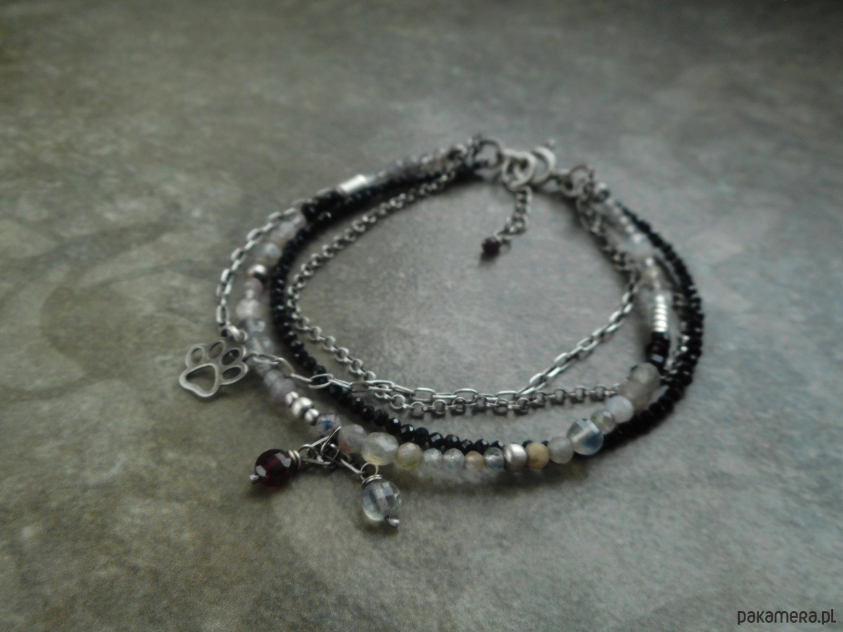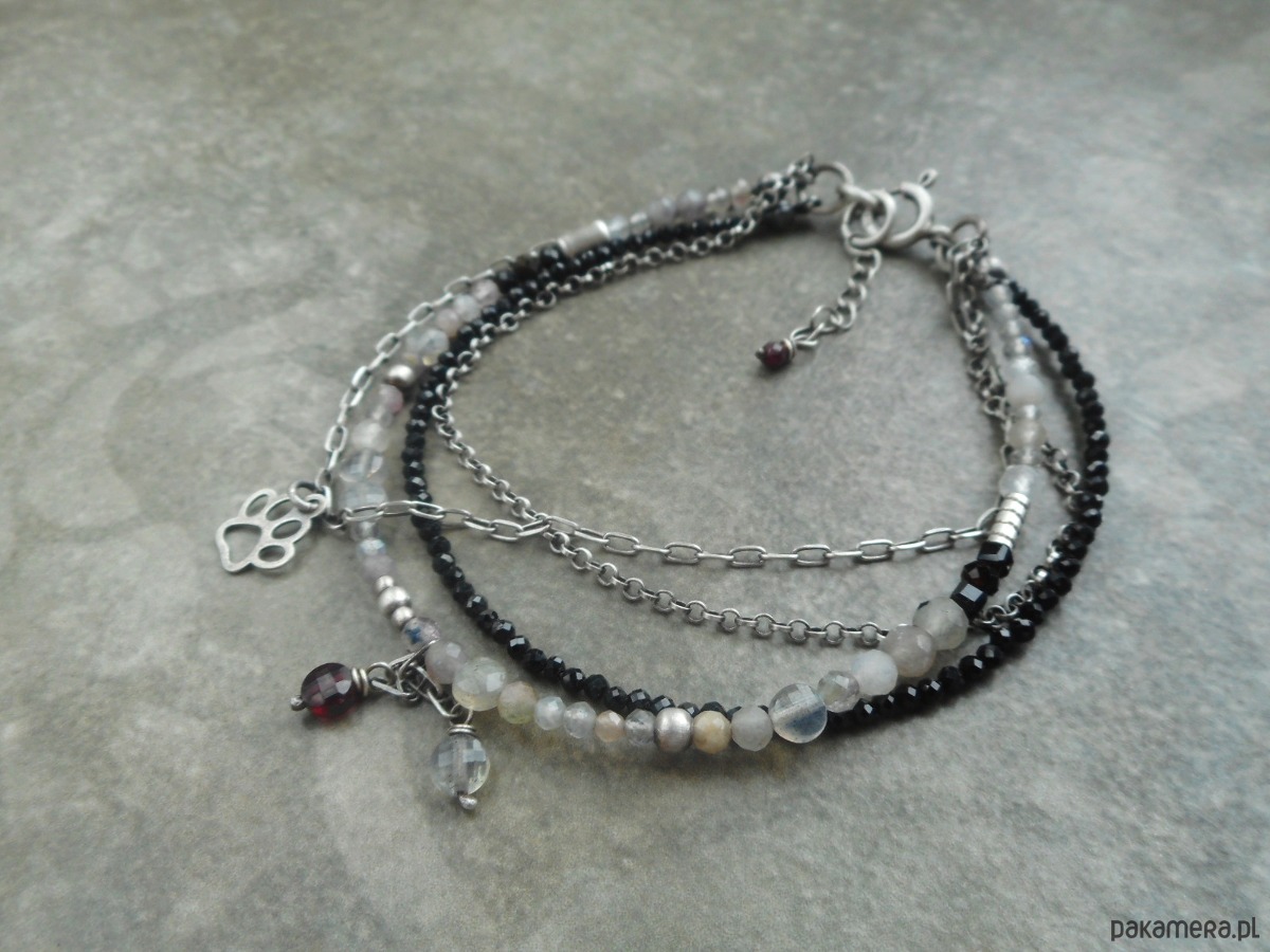 Stylowa, delikatna bransoletka z kamieni szlachetnych i srebra; lśniące labradoryty i spinele w towarzystwie oksydowanego srebra nadają biżuterii niepowtarzalnego, nieco surowego charakteru.