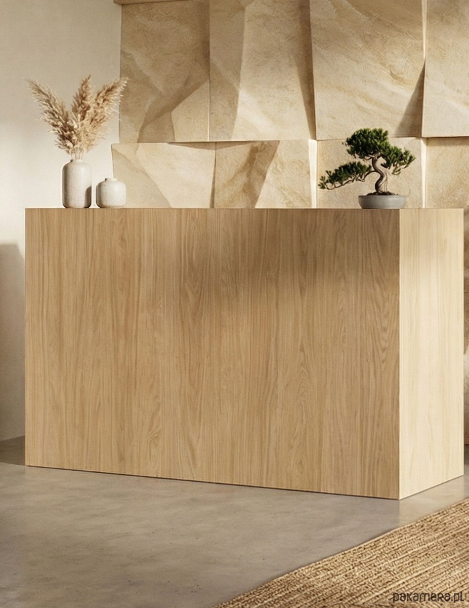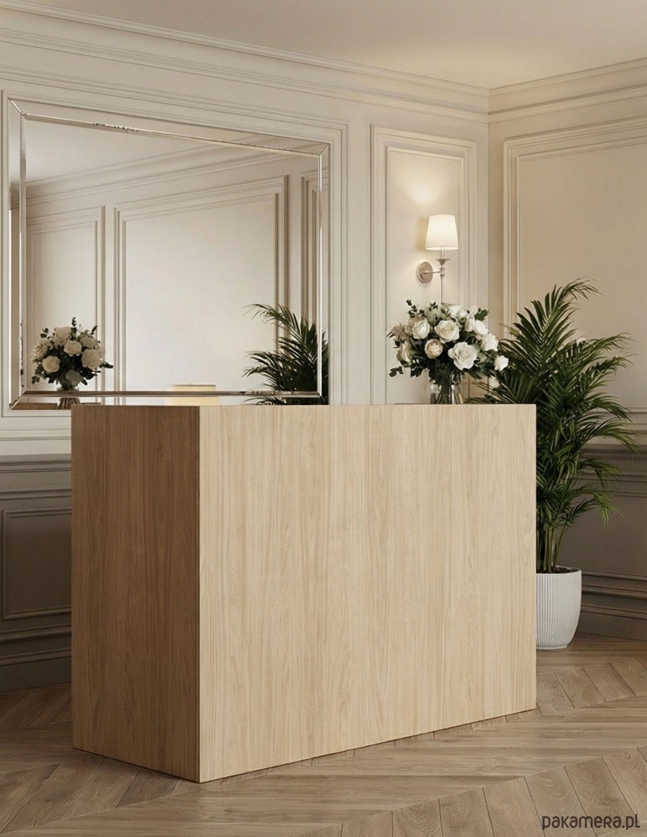 Recepcja o dekorze drewna buduje atmosferę spokoju, harmonii i jakości. Naturalna struktura drewna ociepla przestrzeń i sprawia, że wnętrze staje się bardziej przyjazne dla klienta.