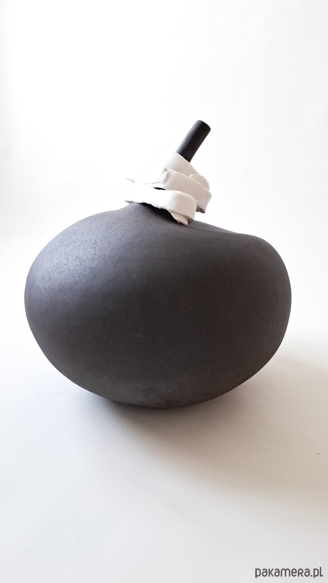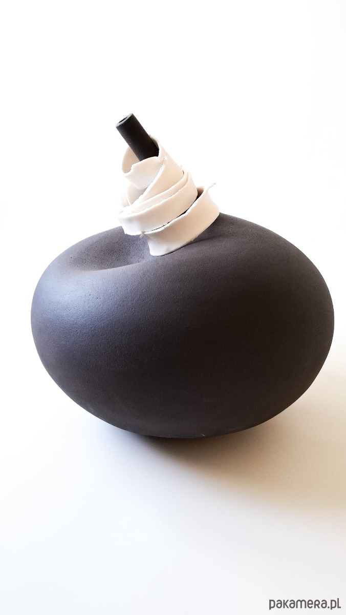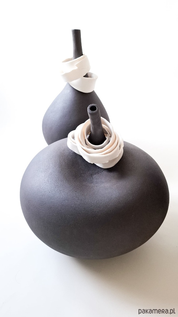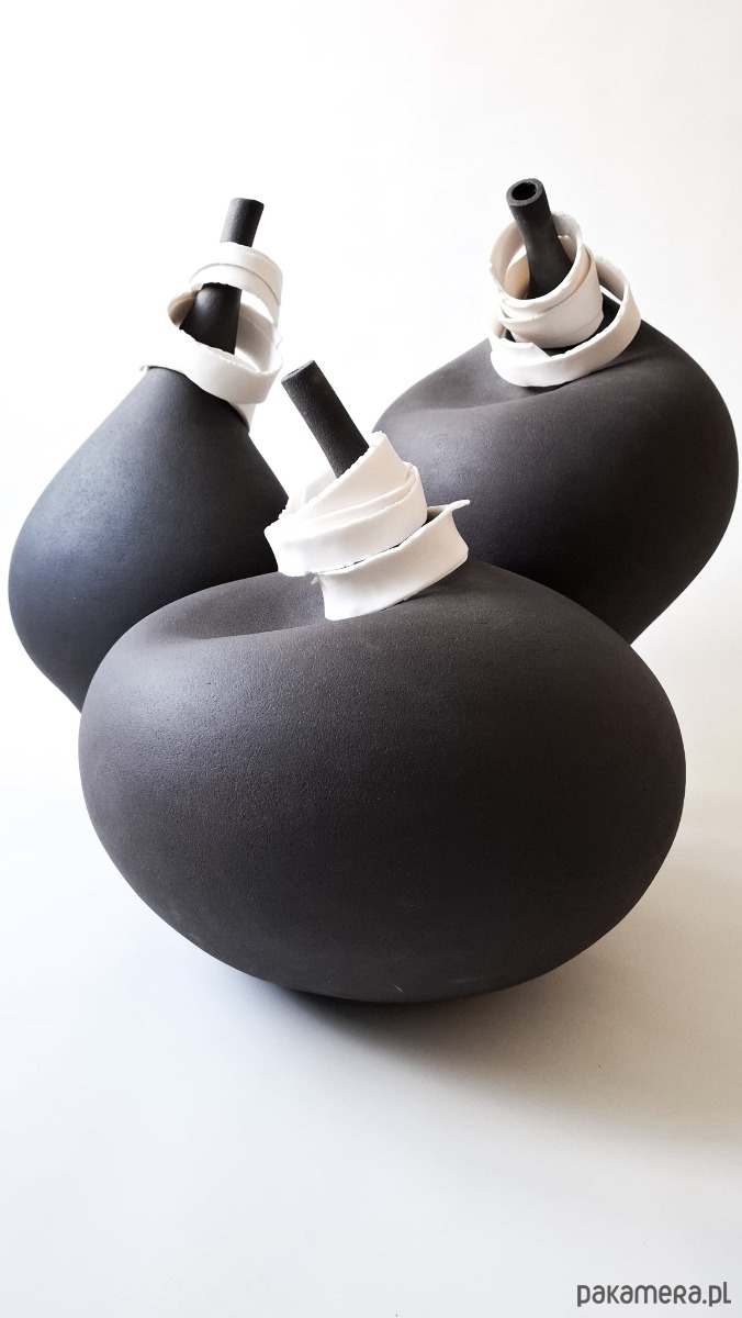 Lady BELLY to cykl prac/rzeźb przypominających butle lub antyczne amfory. Wykonane są z antracytowej masy szamotowej i połączone z dekoracyjnymi elementami z polerowanej, rwanej porcelany.