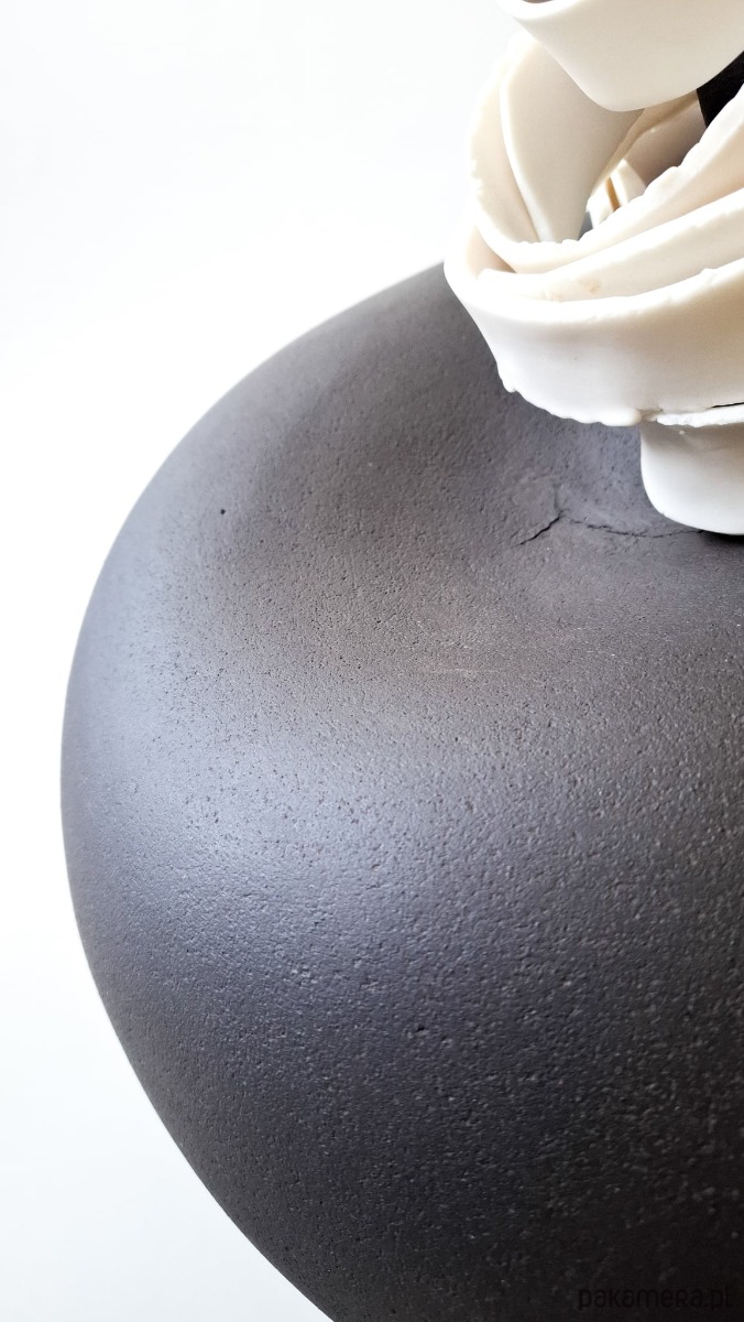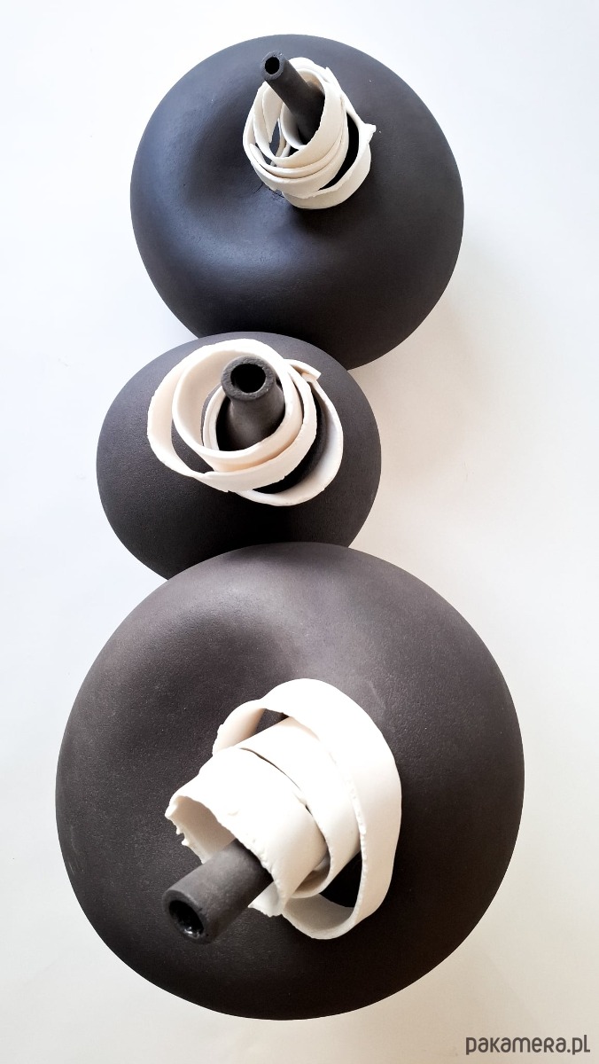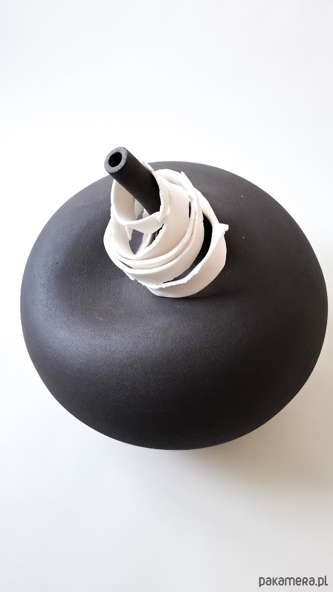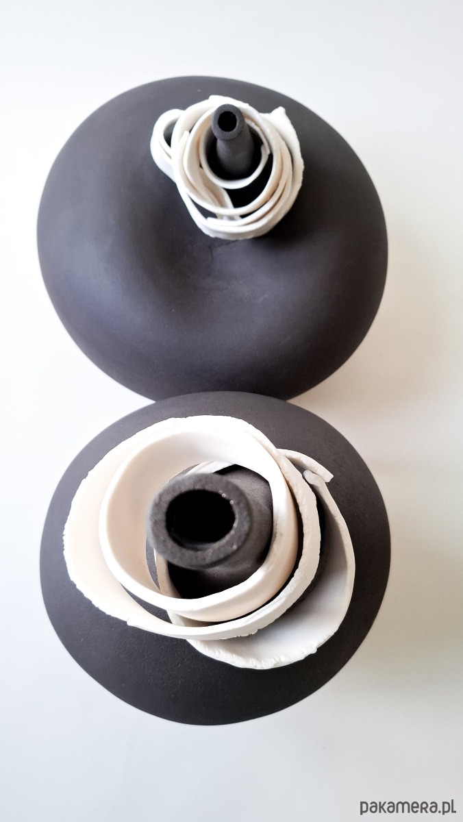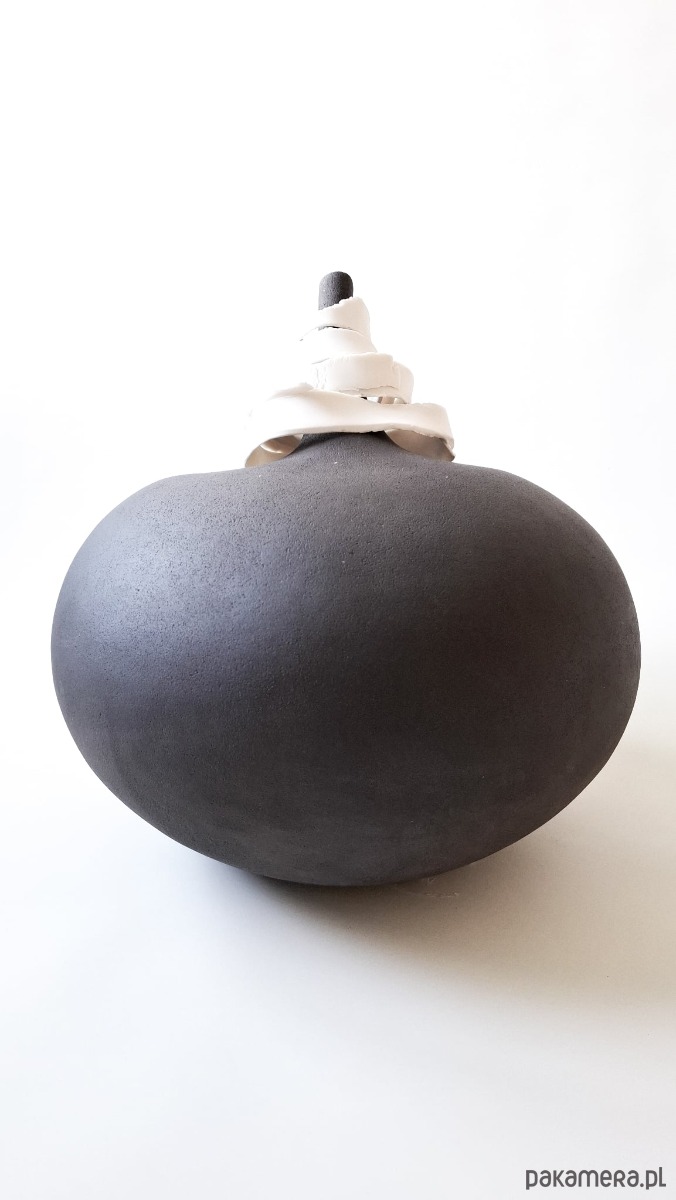 Lady BELLY to cykl prac/rzeźb przypominających butle lub antyczne amfory. Wykonane są z antracytowej masy szamotowej i połączone z dekoracyjnymi elementami z polerowanej, rwanej porcelany.