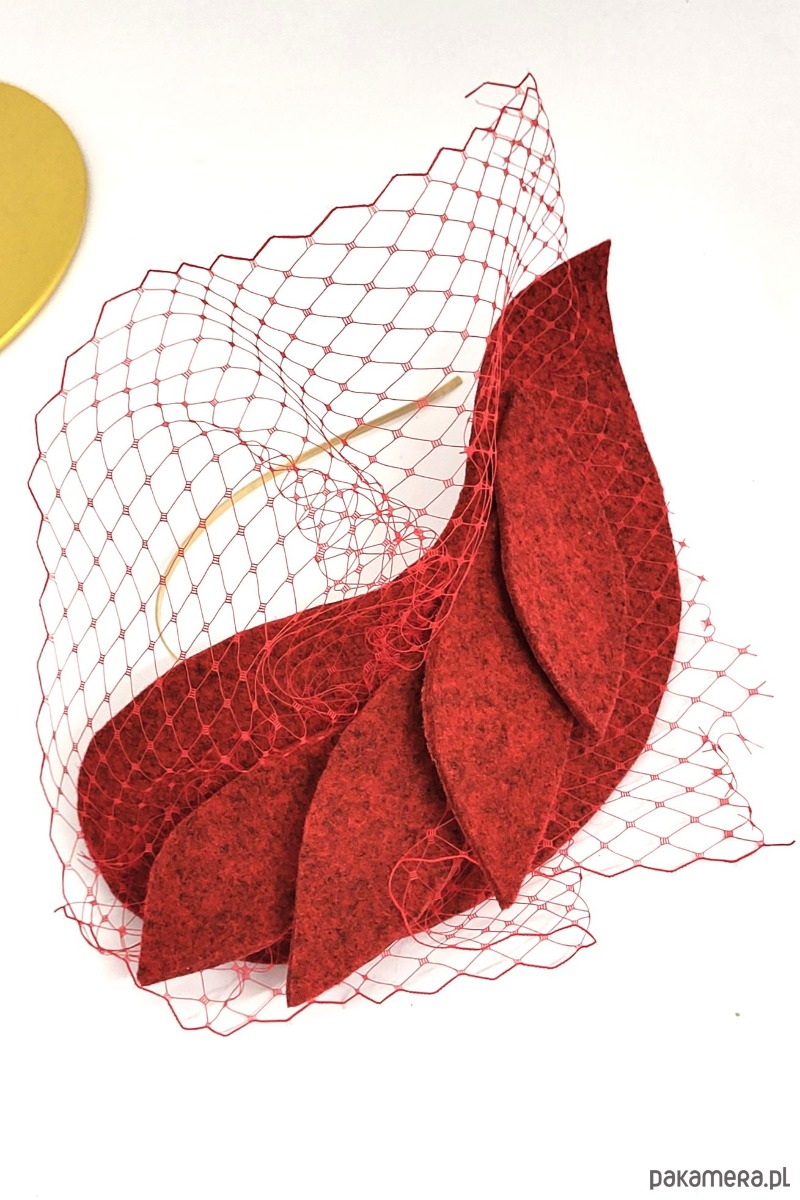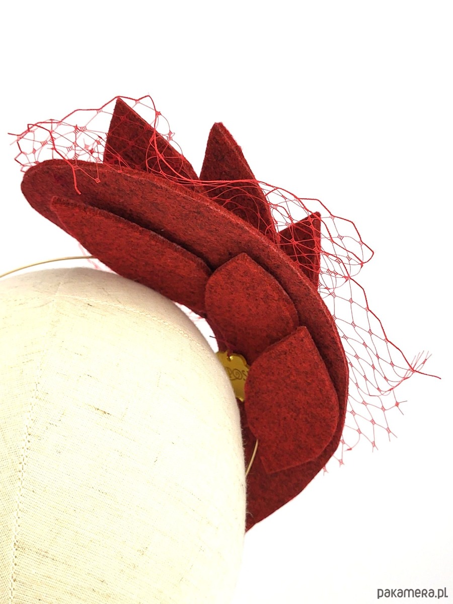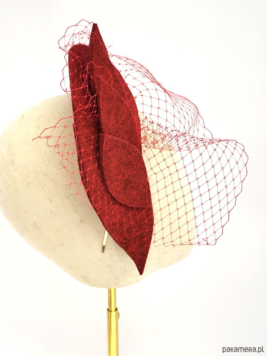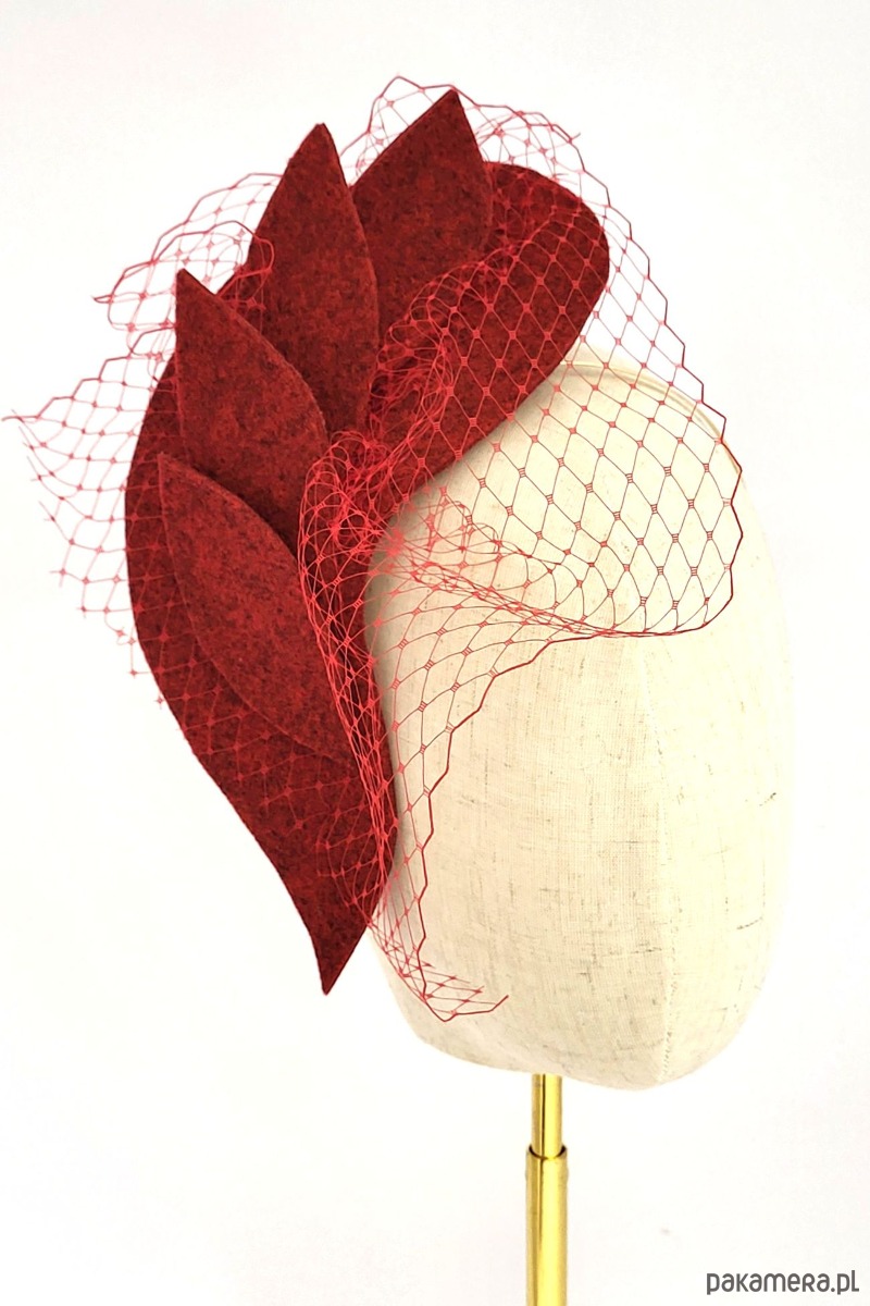 Odważny, asymetryczny fascynator dla kobiet, które nie lubią ginąć w tłumie. Wykonany z wysokiej jakości czerwonego filcu, uformowanego w dynamiczne, zachodzące na siebie płatki, które nadają całości rzeźbiarski charakter.
