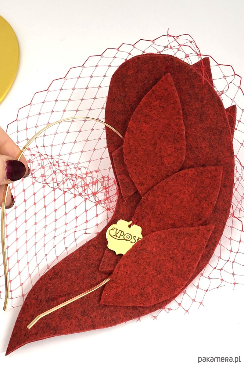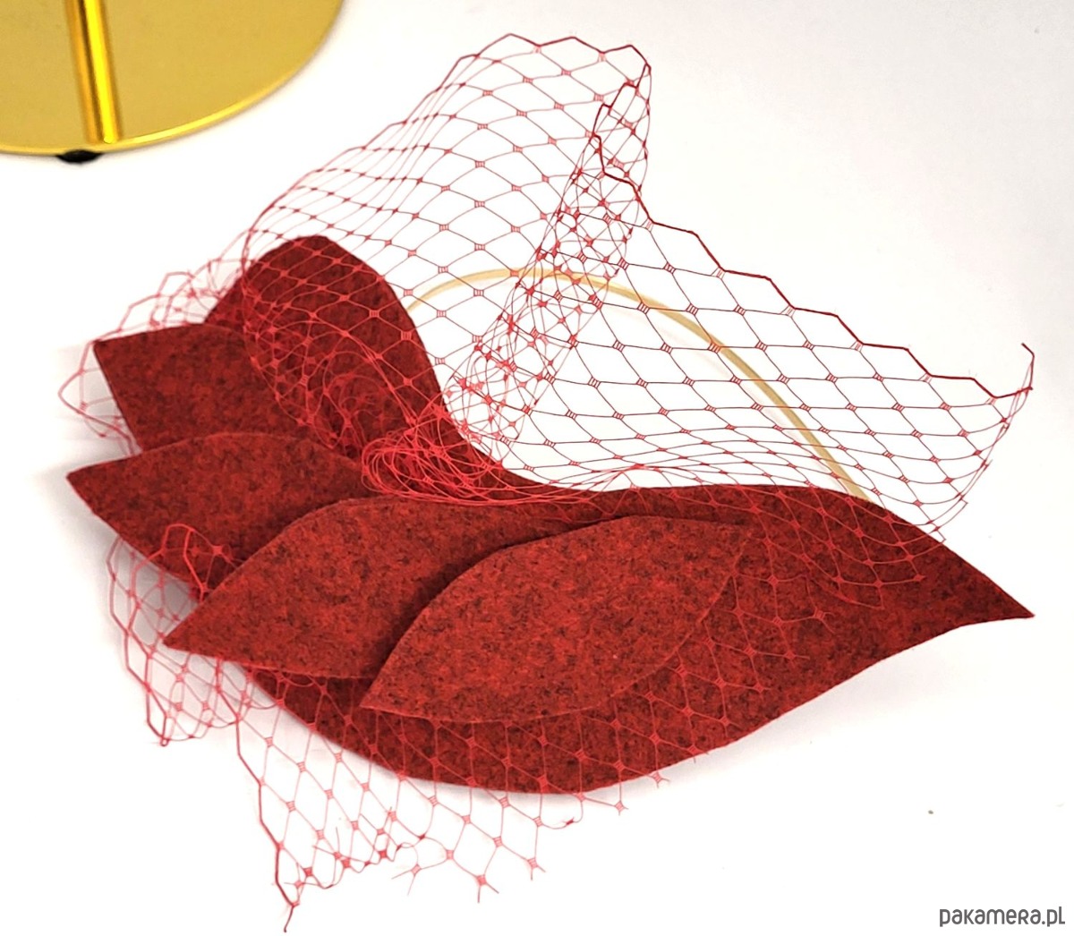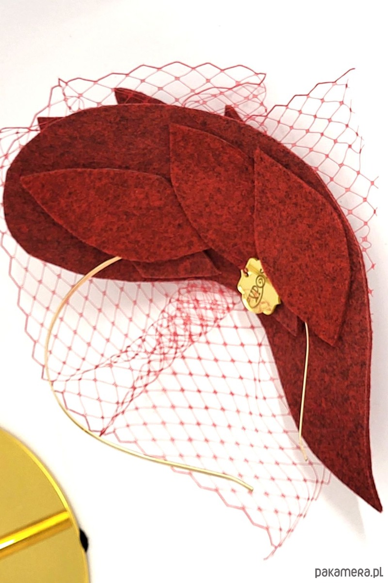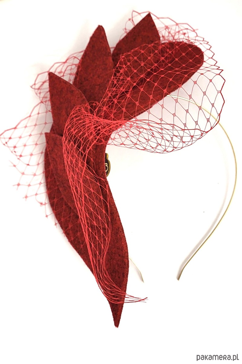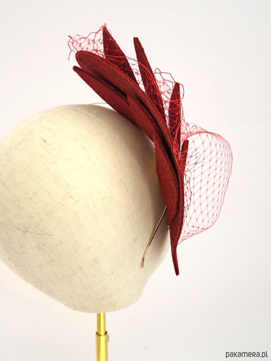 Odważny, asymetryczny fascynator dla kobiet, które nie lubią ginąć w tłumie. Wykonany z wysokiej jakości czerwonego filcu, uformowanego w dynamiczne, zachodzące na siebie płatki, które nadają całości rzeźbiarski charakter.
