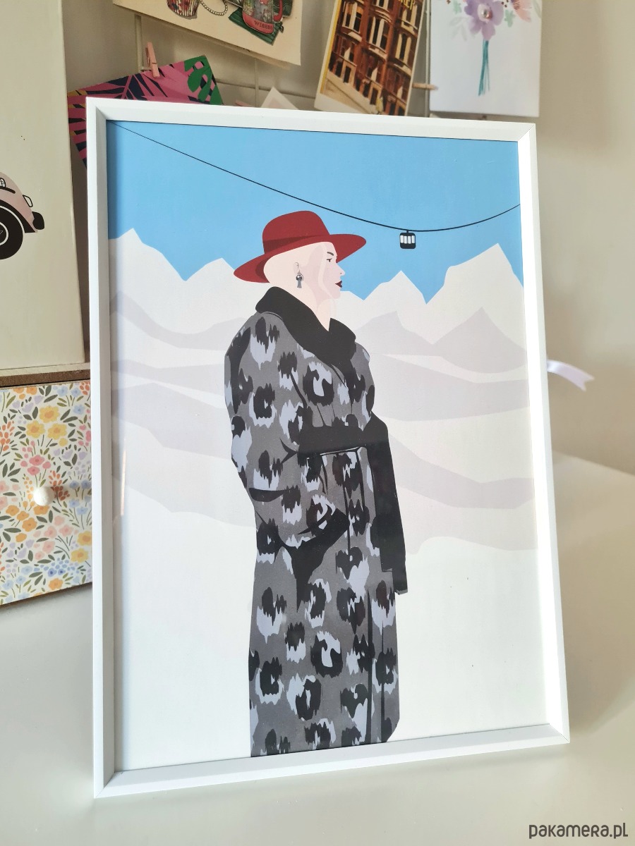 Grafika dla miłośniczek kobiecego, francuskiego stylu: elegantka w futrze w kocie cętki i intrygującym karminowym kapeluszu kontempluje ośnieżony górski krajobraz z kolejką górską w oddali: czuć luksus, kobiecą energię i mroźne alpejskie powietrze.