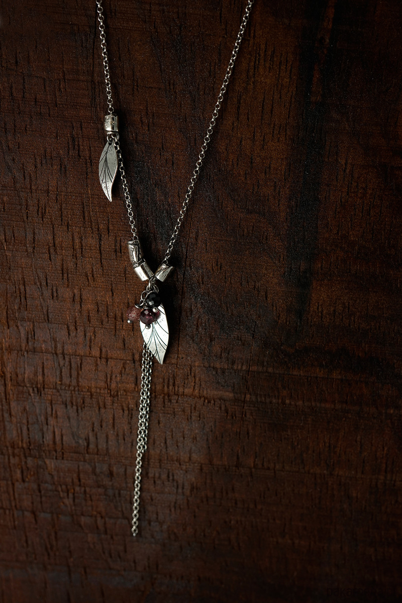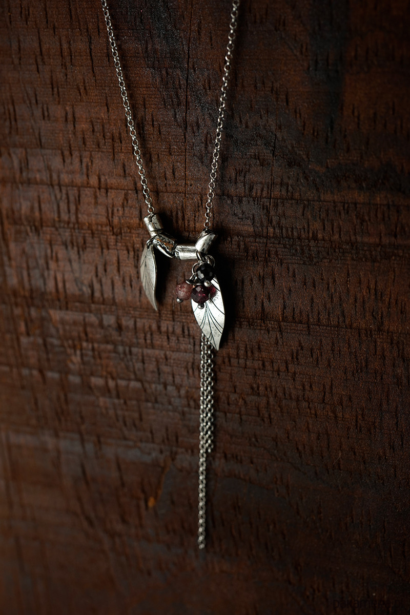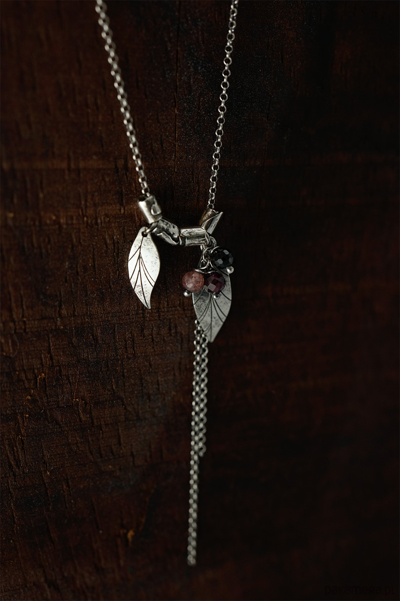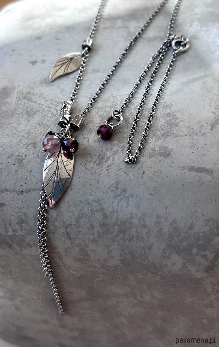 Delikatny, wiosenny naszyjnik wykonany ze srebra i kamieni naturalnych (granat, kwarc truskawkowy, onyks). Srebro oksydowane.