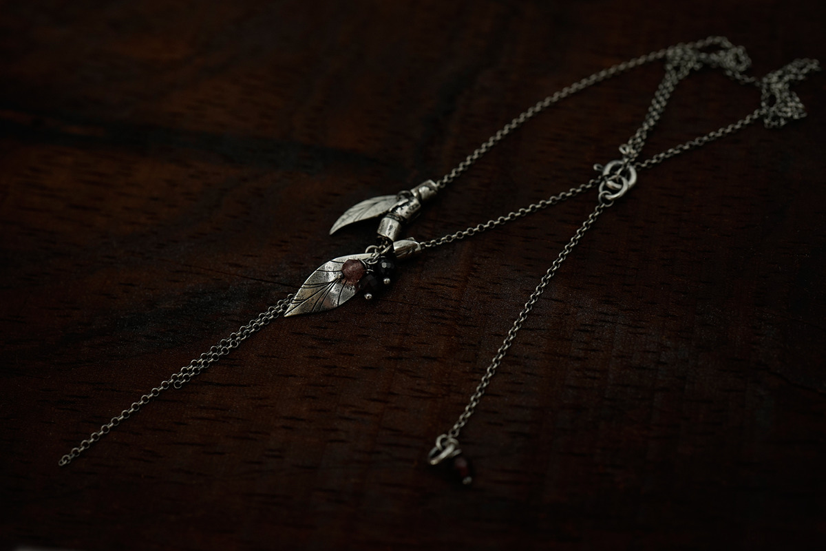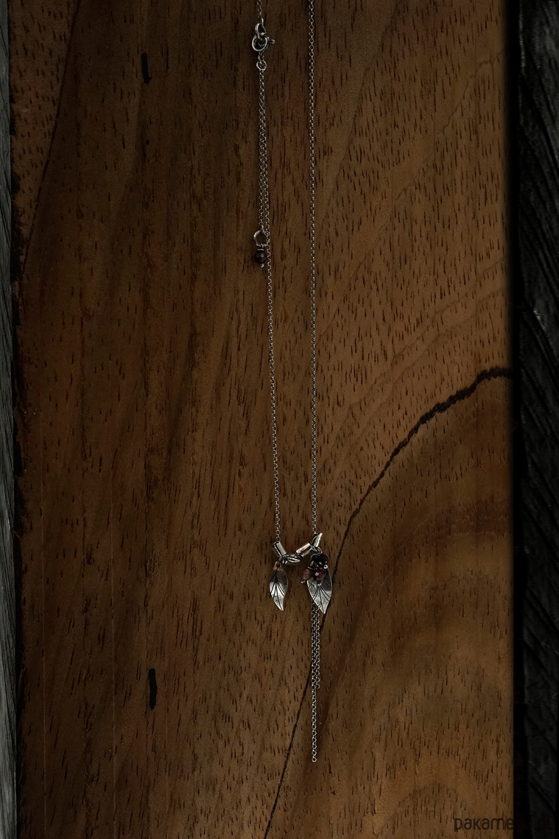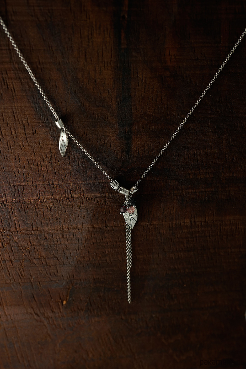 Delikatny, wiosenny naszyjnik wykonany ze srebra i kamieni naturalnych (granat, kwarc truskawkowy, onyks). Srebro oksydowane.