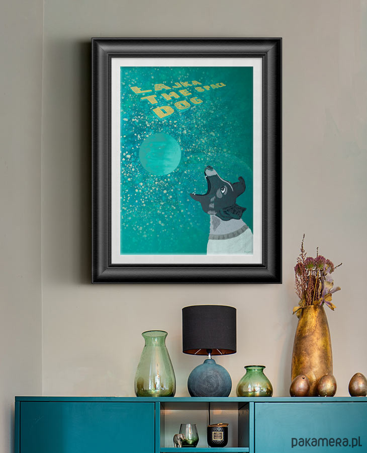 Plakat z autorską grafiką przedstawiający psa Łajkę w kosmosie. Łajka jako pierwsza została wysłana na orbitę okołoziemską w 1957 roku.