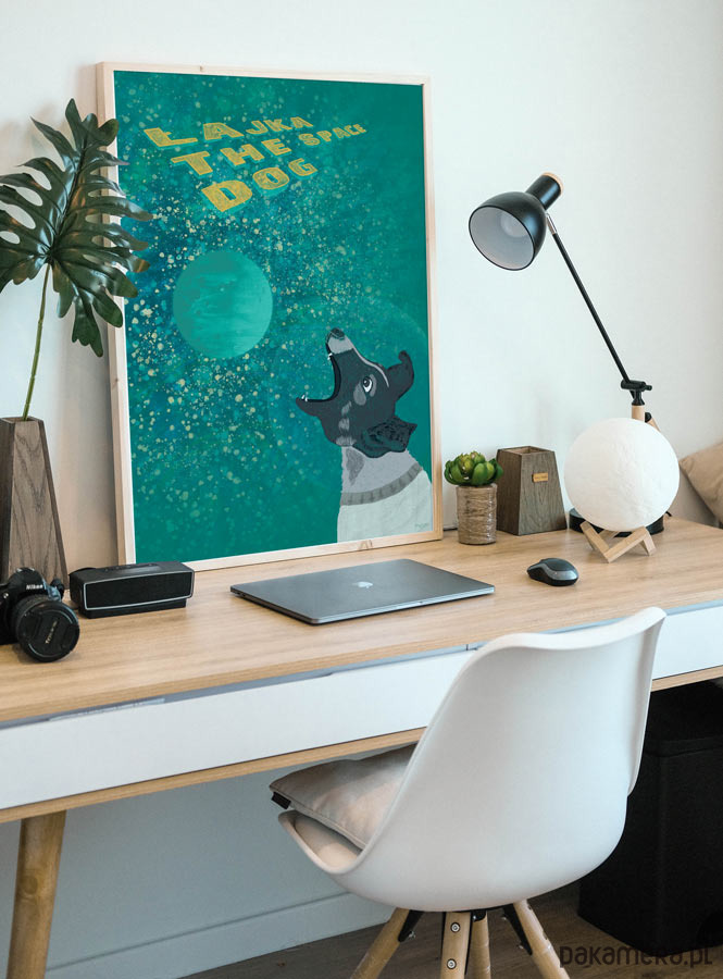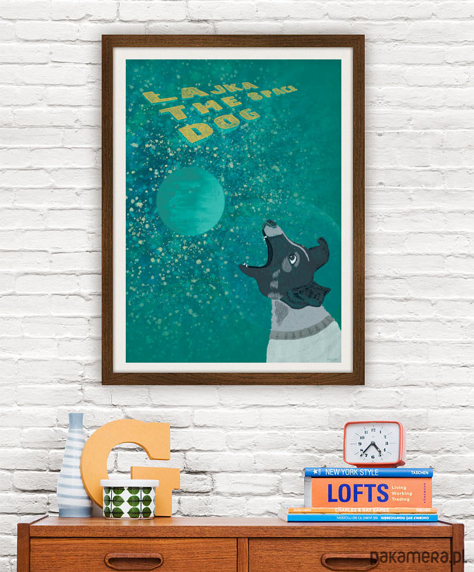 Plakat z autorską grafiką przedstawiający psa Łajkę w kosmosie. Łajka jako pierwsza została wysłana na orbitę okołoziemską w 1957 roku.
