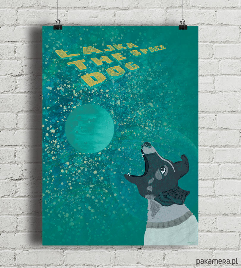 Plakat z autorską grafiką przedstawiający psa Łajkę w kosmosie. Łajka jako pierwsza została wysłana na orbitę okołoziemską w 1957 roku.