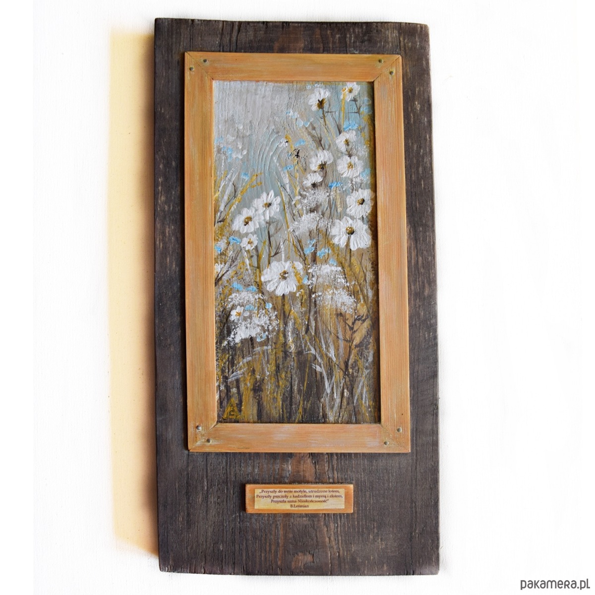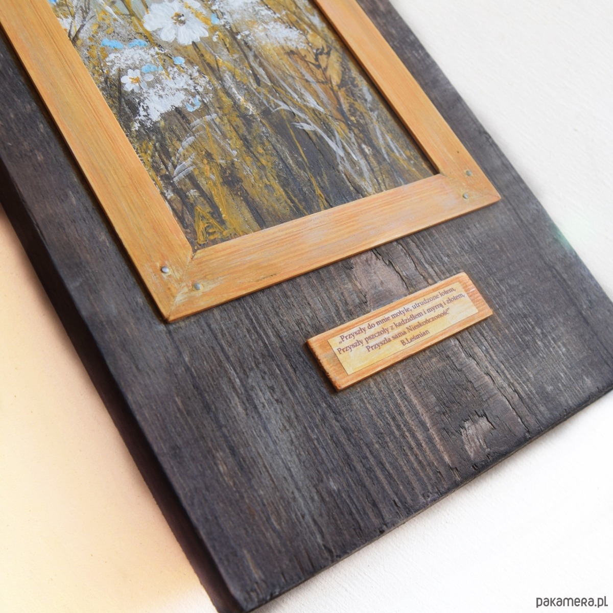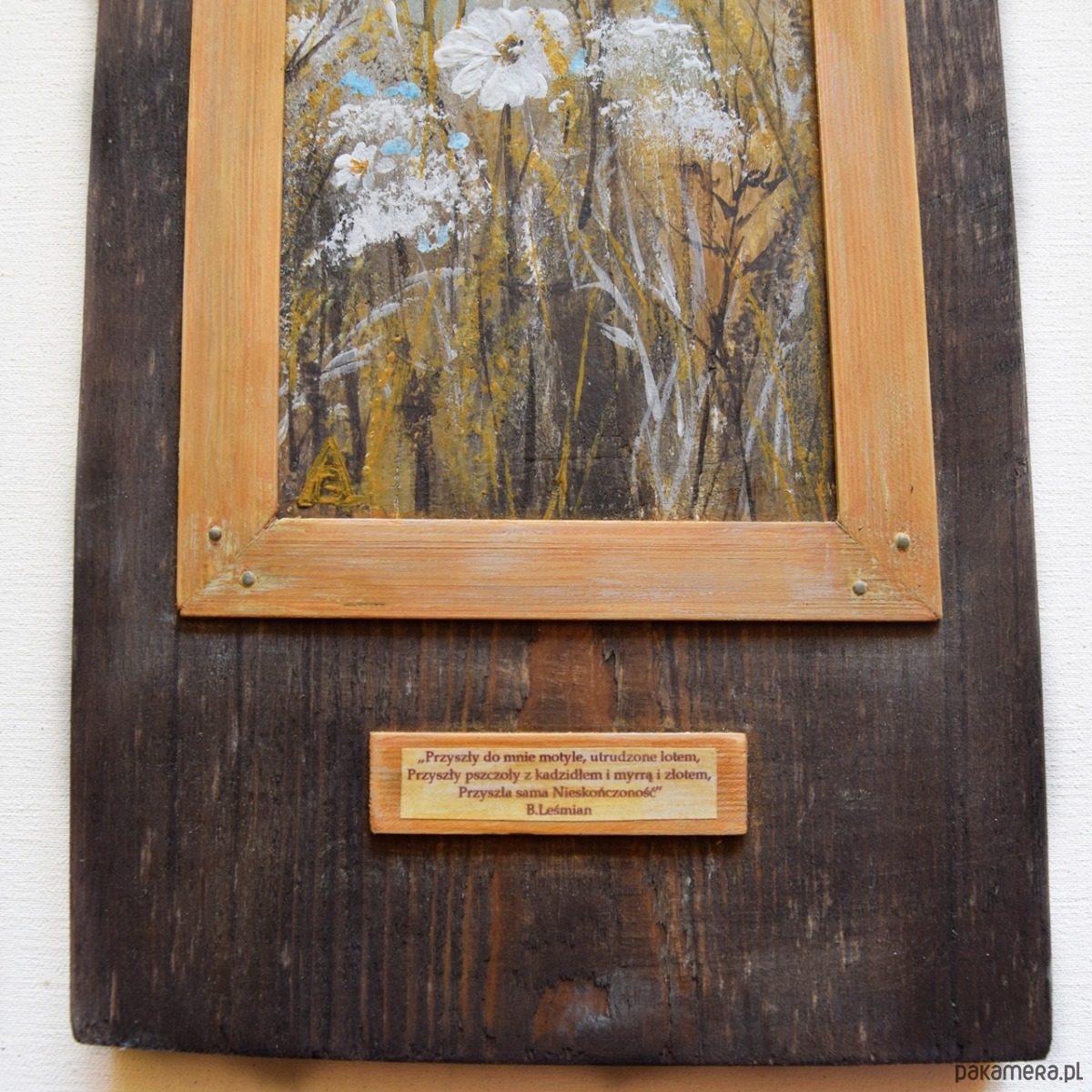 Obraz malowany farbami akrylowymi na kawałku grubej deski sosnowej (deska jest bejcowana, łąka malowana farbami akrylowymi), cytat pochodzi ze zbioru wierszy pt. Łąka Bolesława Leśmiana.