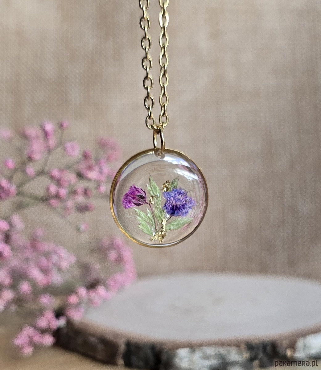 Oferuję Państwu unikalną biżuterię. Zawieszka jest wykonana z suszonych kwiatów i żywicy epoksydowej. Biżuteria jest wspaniałym i oryginalnym prezentem na lata.
