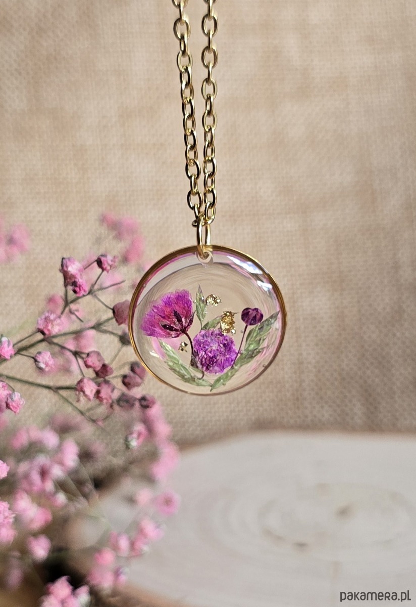 Oferuję Państwu unikalną biżuterię. Zawieszka jest wykonana z suszonych kwiatów i żywicy epoksydowej. Biżuteria jest wspaniałym i oryginalnym prezentem na lata.