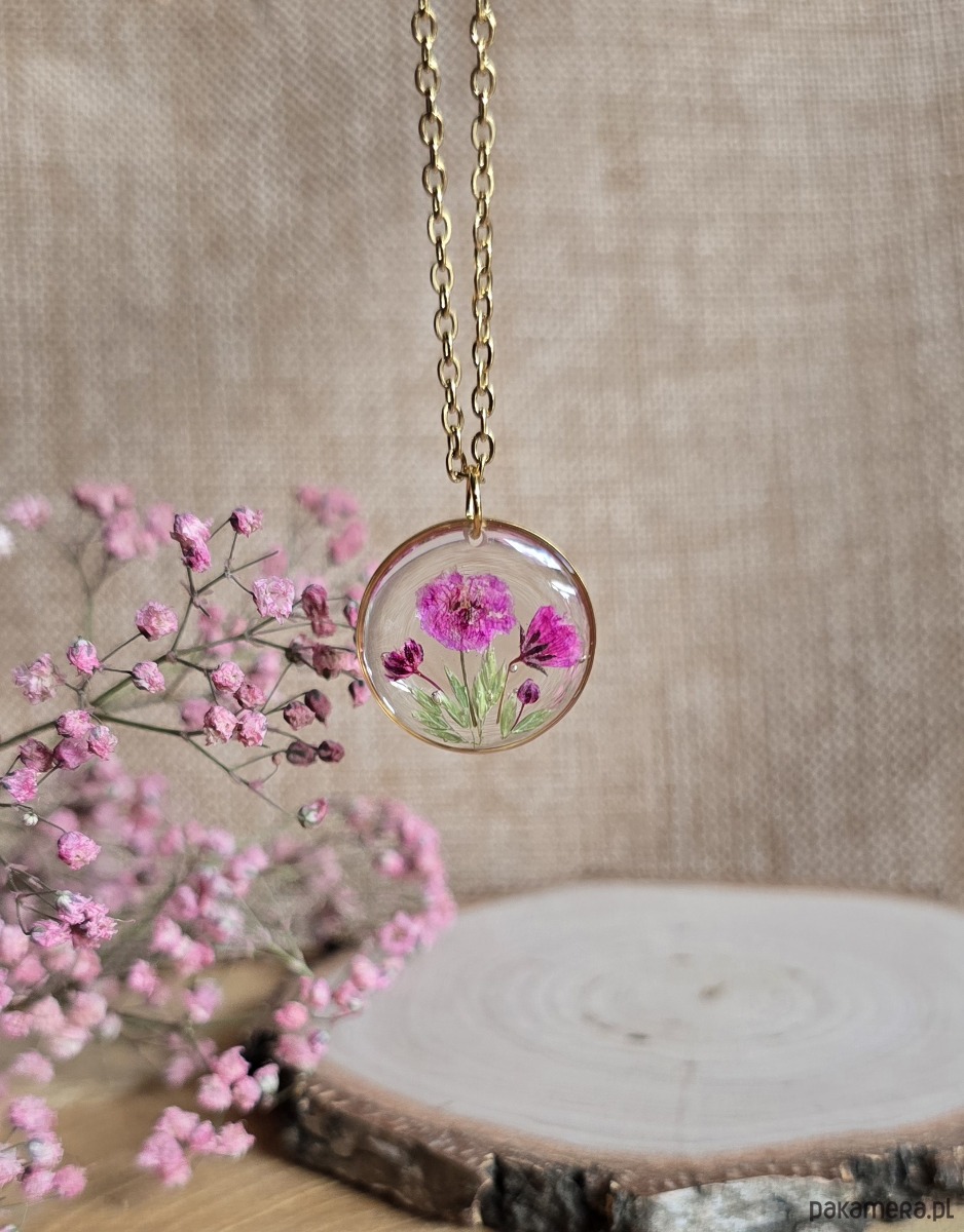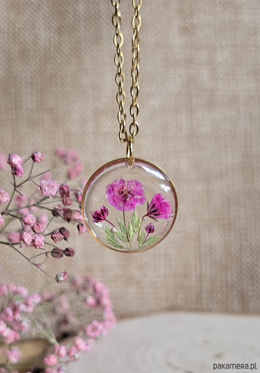 Oferuję Państwu unikalną biżuterię. Zawieszka jest wykonana z suszonych kwiatów i żywicy epoksydowej. Biżuteria jest wspaniałym i oryginalnym prezentem na lata.