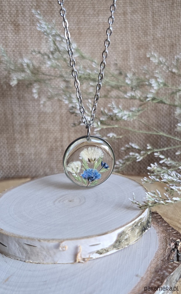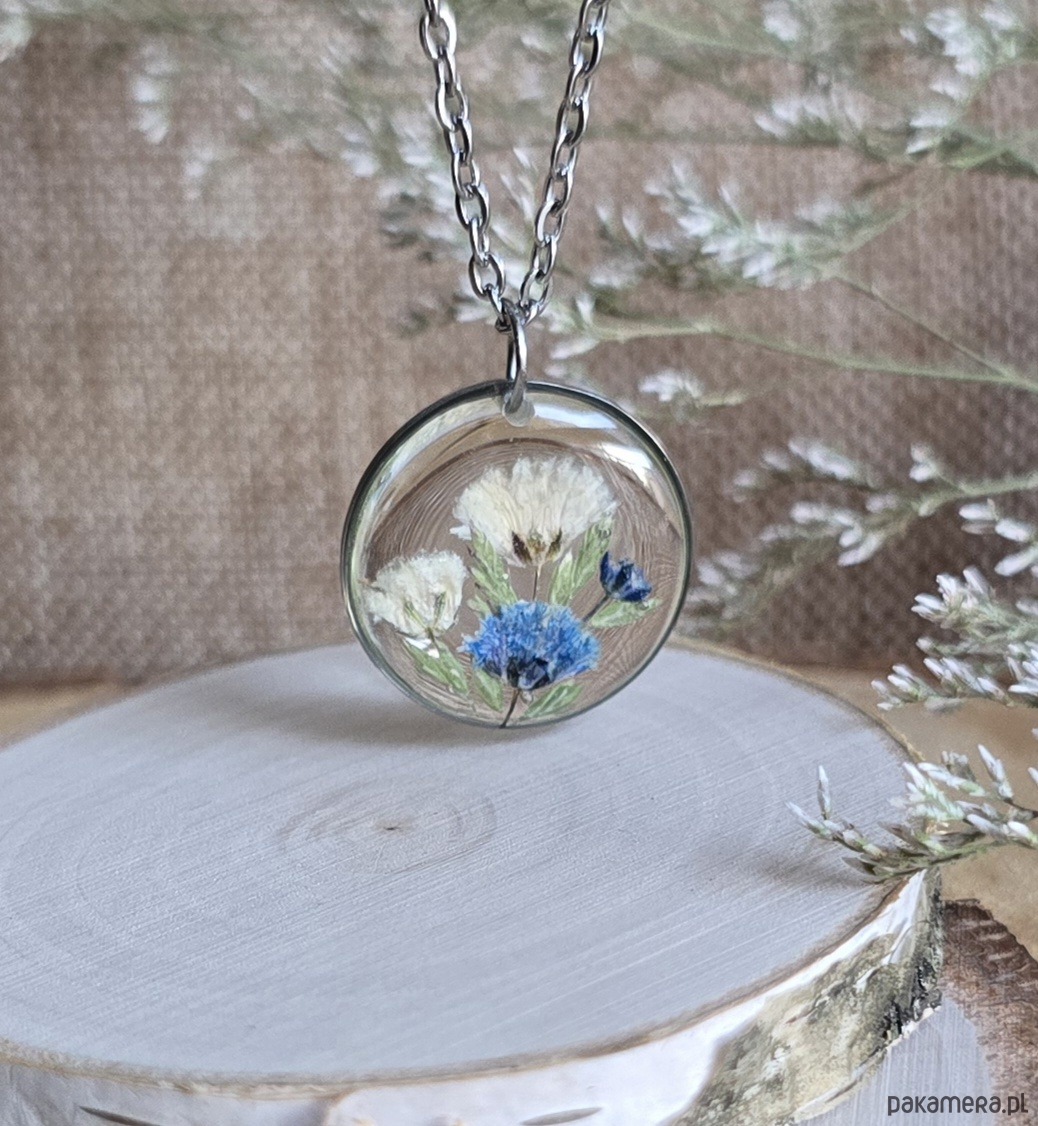 Oferuję Państwu unikalną biżuterię. Zawieszka jest wykonana z suszonych kwiatów i żywicy epoksydowej. Biżuteria jest wspaniałym i oryginalnym prezentem na lata.