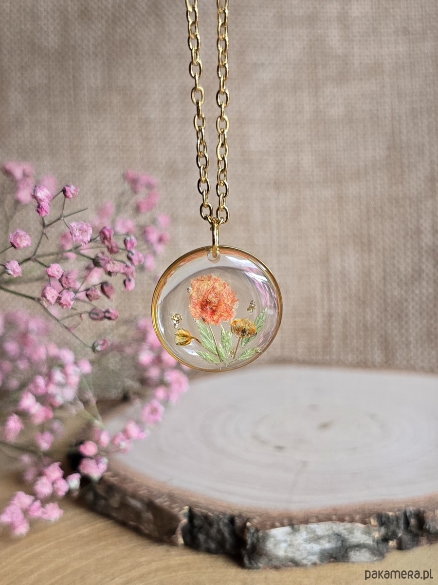 Oferuję Państwu unikalną biżuterię. Zawieszka jest wykonana z suszonych kwiatów i żywicy epoksydowej. Biżuteria jest wspaniałym i oryginalnym prezentem na lata.