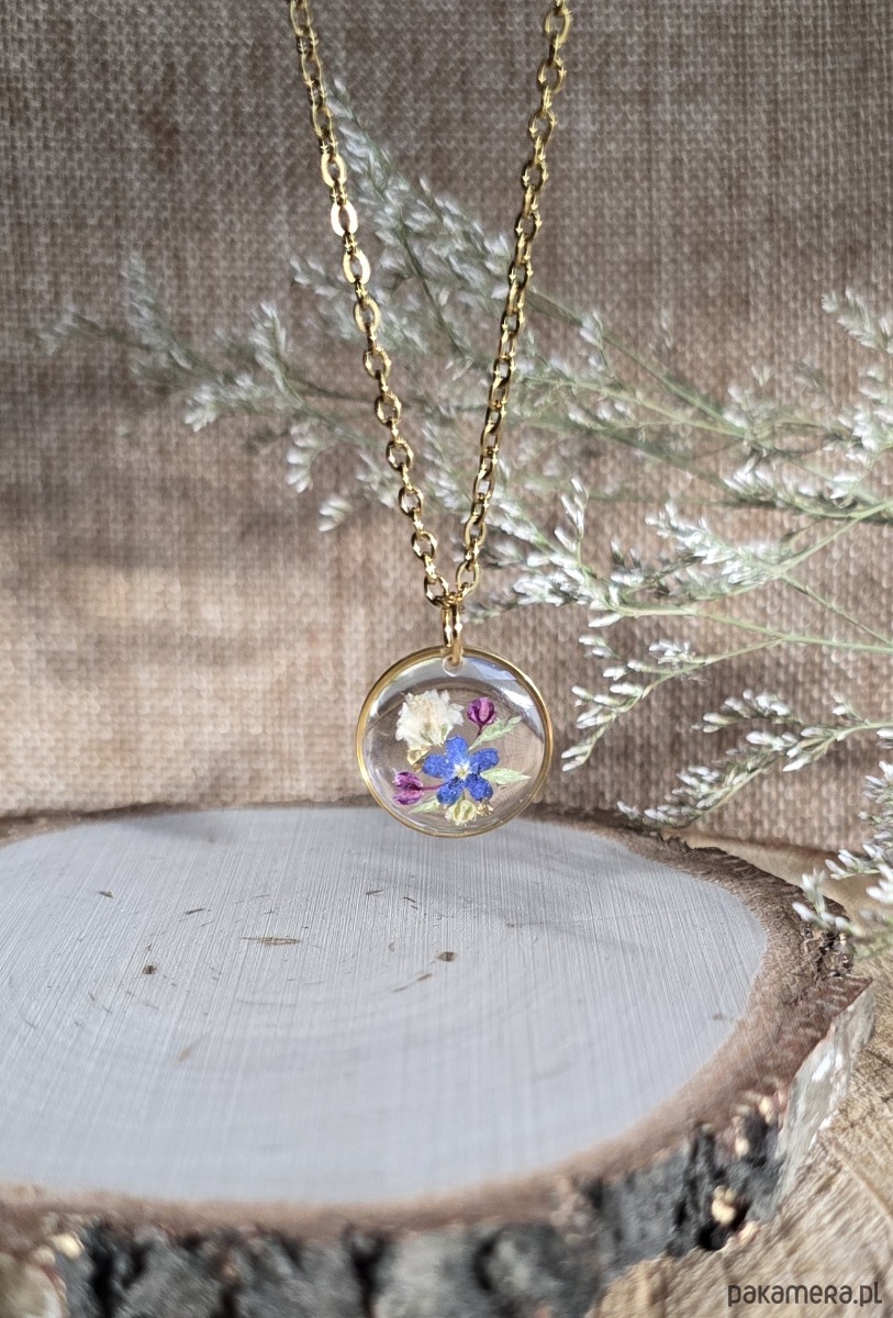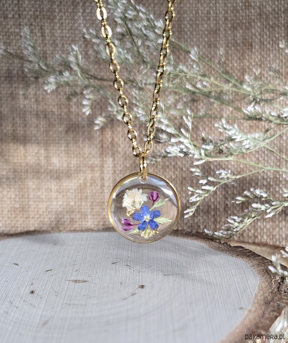 Oferuję Państwu unikalną biżuterię. Zawieszka jest wykonana z suszonych kwiatów i żywicy epoksydowej. Biżuteria jest wspaniałym i oryginalnym prezentem na lata.