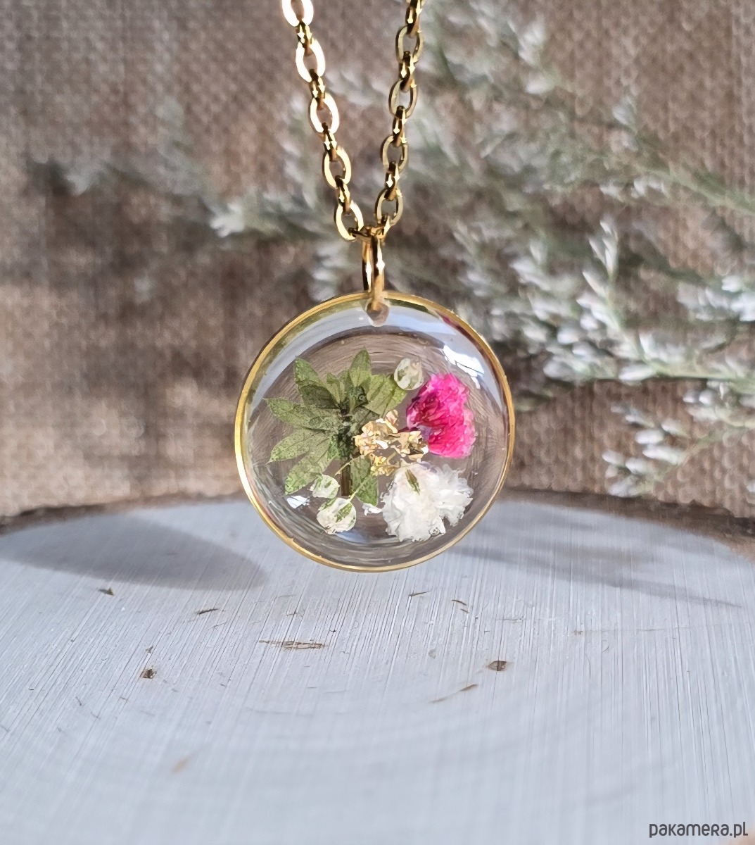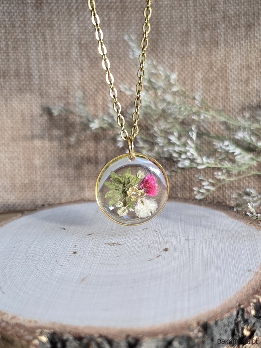 Oferuję Państwu unikalną biżuterię. Zawieszka jest wykonana z suszonych kwiatów i żywicy epoksydowej. Biżuteria jest wspaniałym i oryginalnym prezentem na lata.
