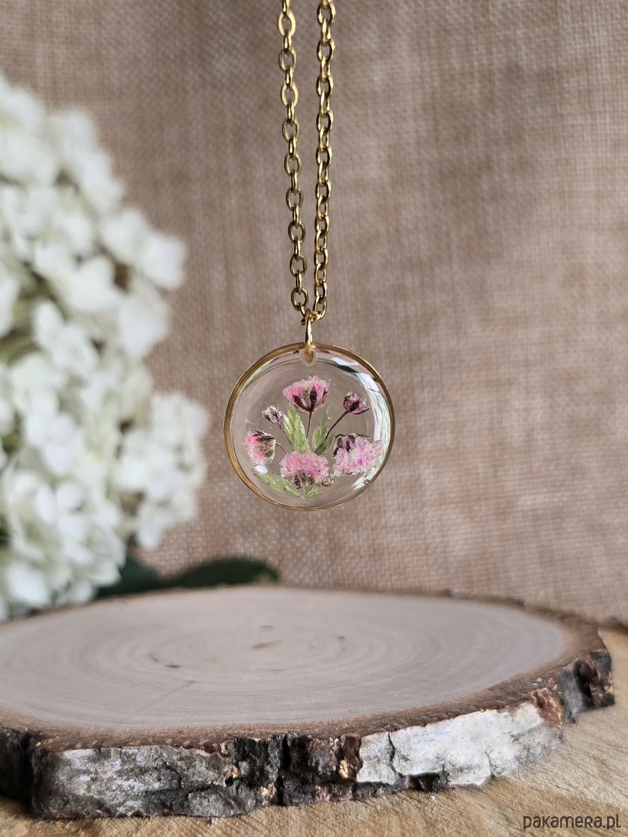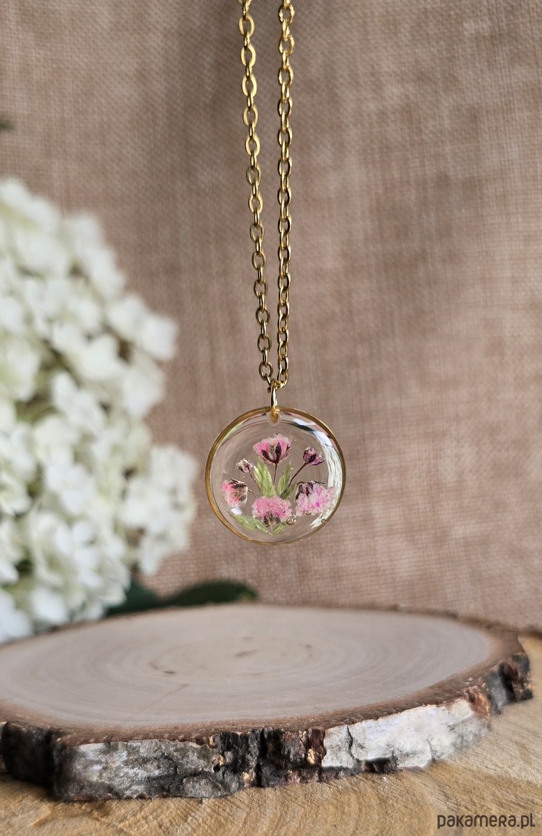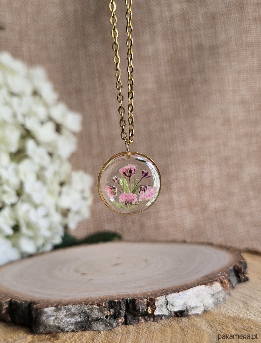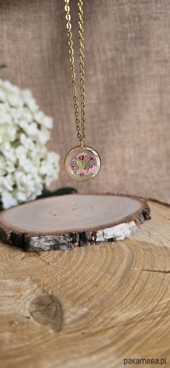 Oferuję Państwu unikalną biżuterię. Zawieszka jest wykonana z suszonych kwiatów i żywicy epoksydowej. Biżuteria jest wspaniałym i oryginalnym prezentem na lata.