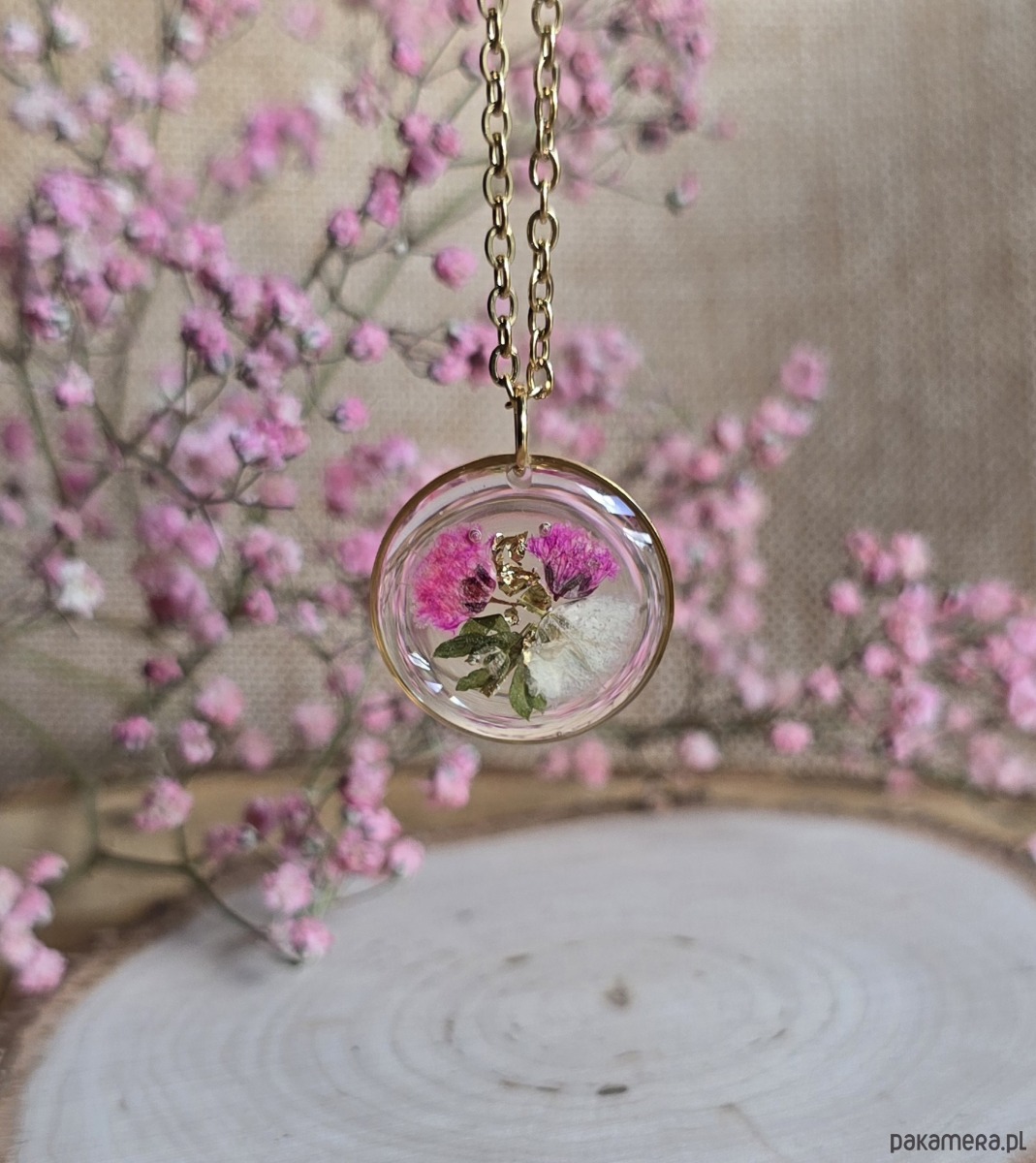 Oferuję Państwu unikalną biżuterię. Zawieszka jest wykonana z suszonych kwiatów i żywicy epoksydowej. Biżuteria jest wspaniałym i oryginalnym prezentem na lata.