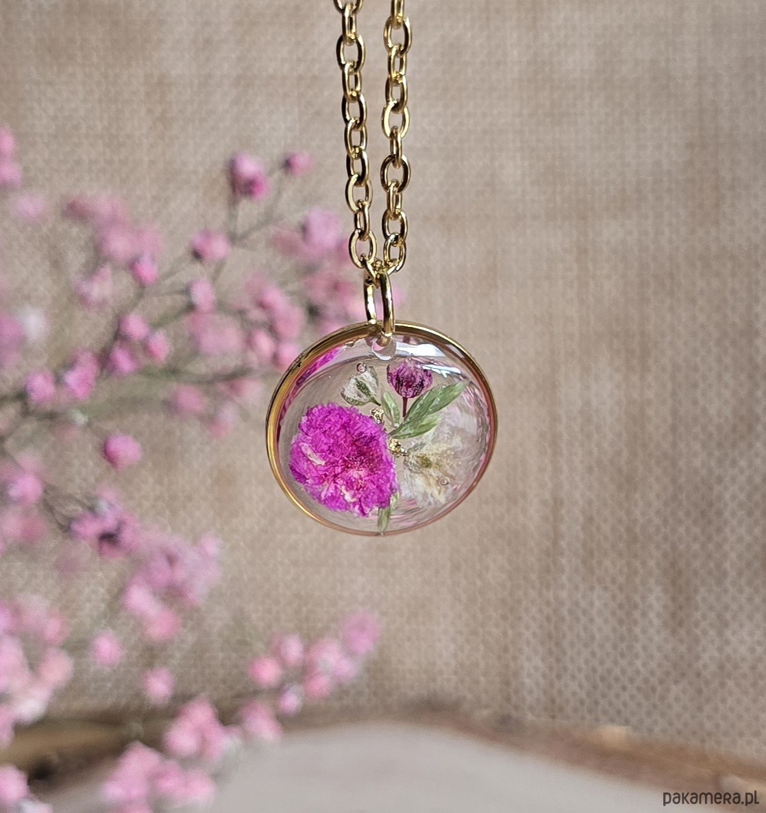 Oferuję Państwu unikalną biżuterię. Zawieszka jest wykonana z suszonych kwiatów i żywicy epoksydowej. Biżuteria jest wspaniałym i oryginalnym prezentem na lata.