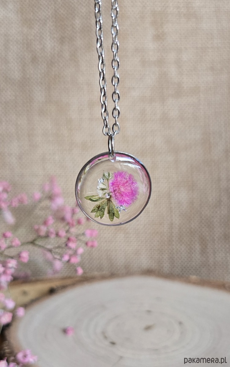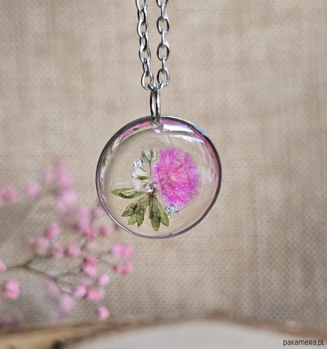 Oferuję Państwu unikalną biżuterię. Zawieszka jest wykonana z suszonych kwiatów i żywicy epoksydowej. Biżuteria jest wspaniałym i oryginalnym prezentem na lata.