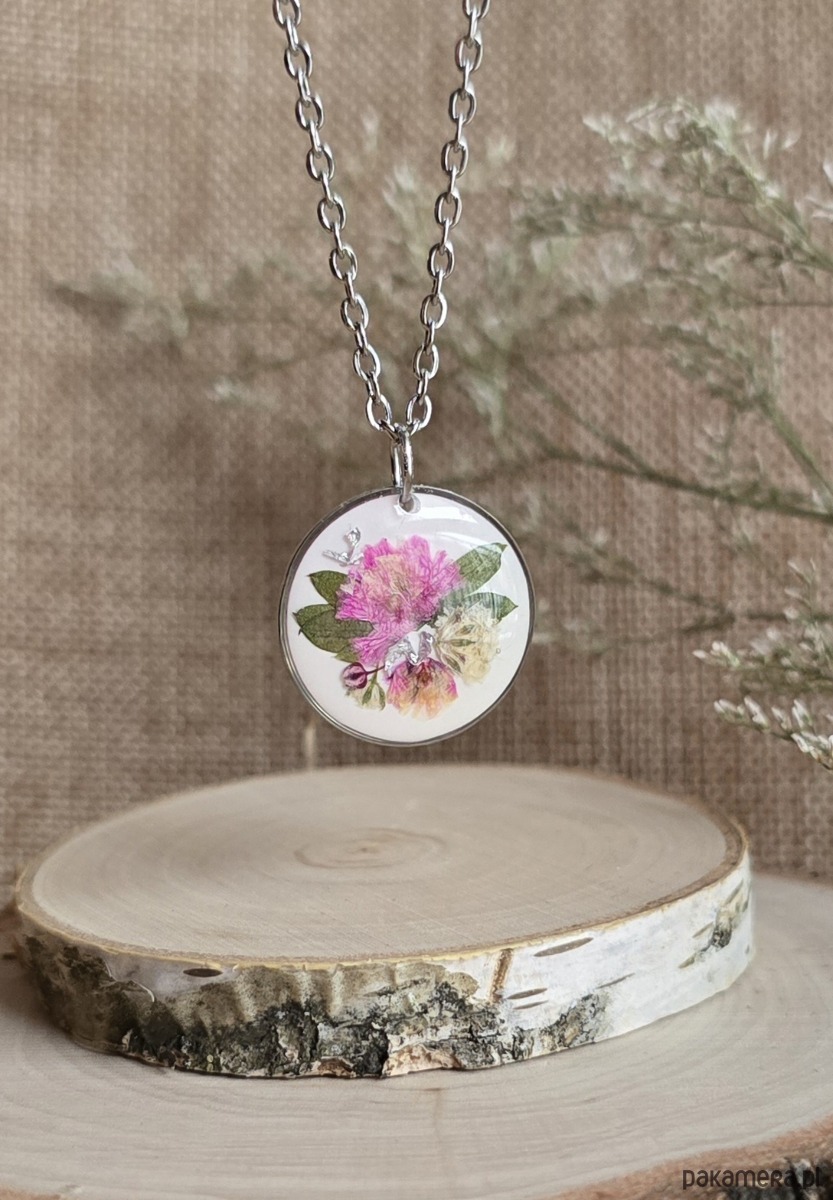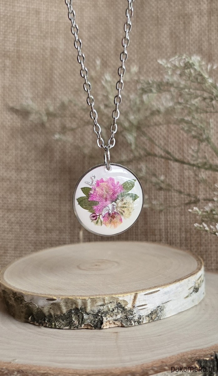 Oferuję Państwu unikalną biżuterię. Zawieszka jest wykonana z suszonych kwiatów i żywicy epoksydowej. Biżuteria jest wspaniałym i oryginalnym prezentem na lata.