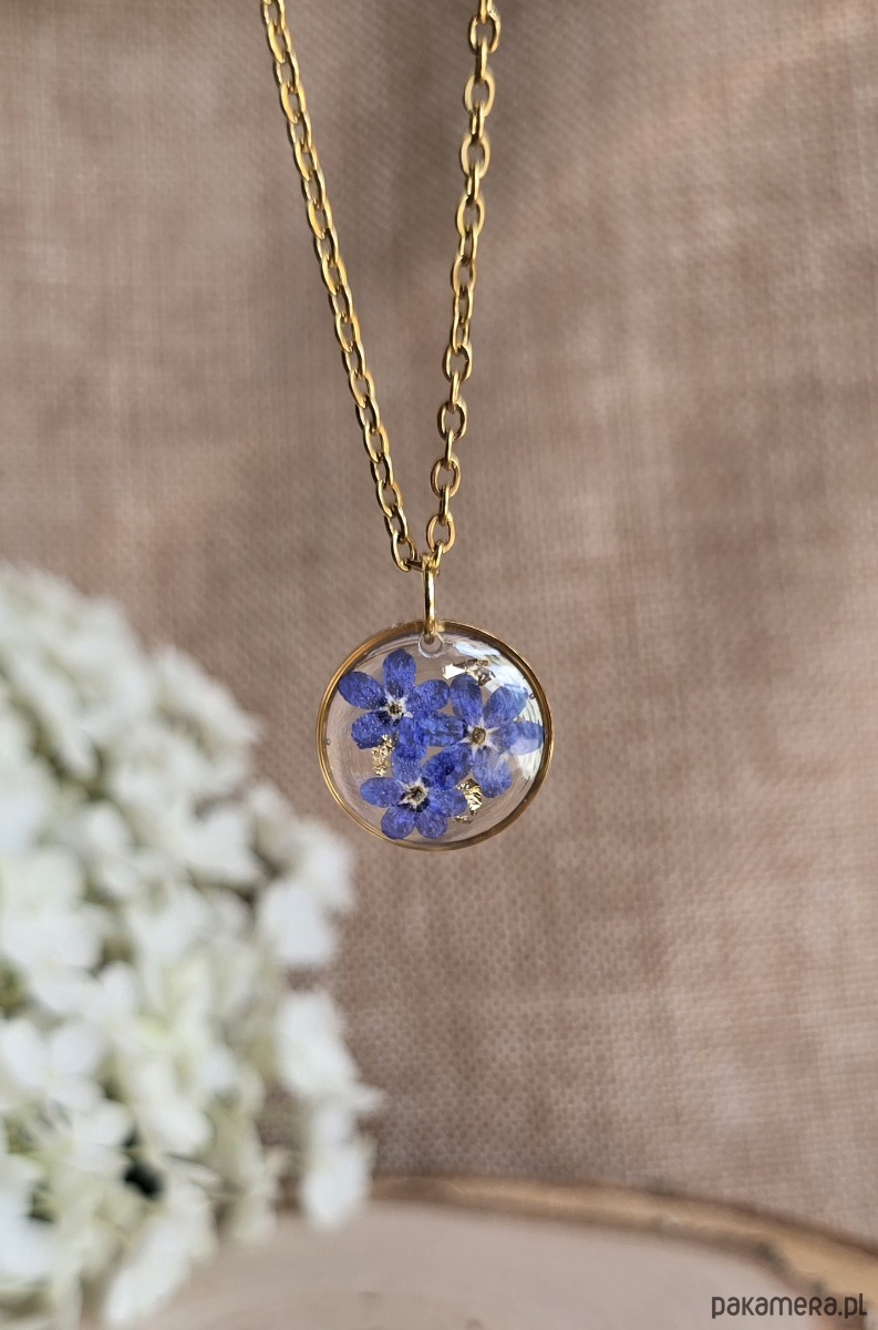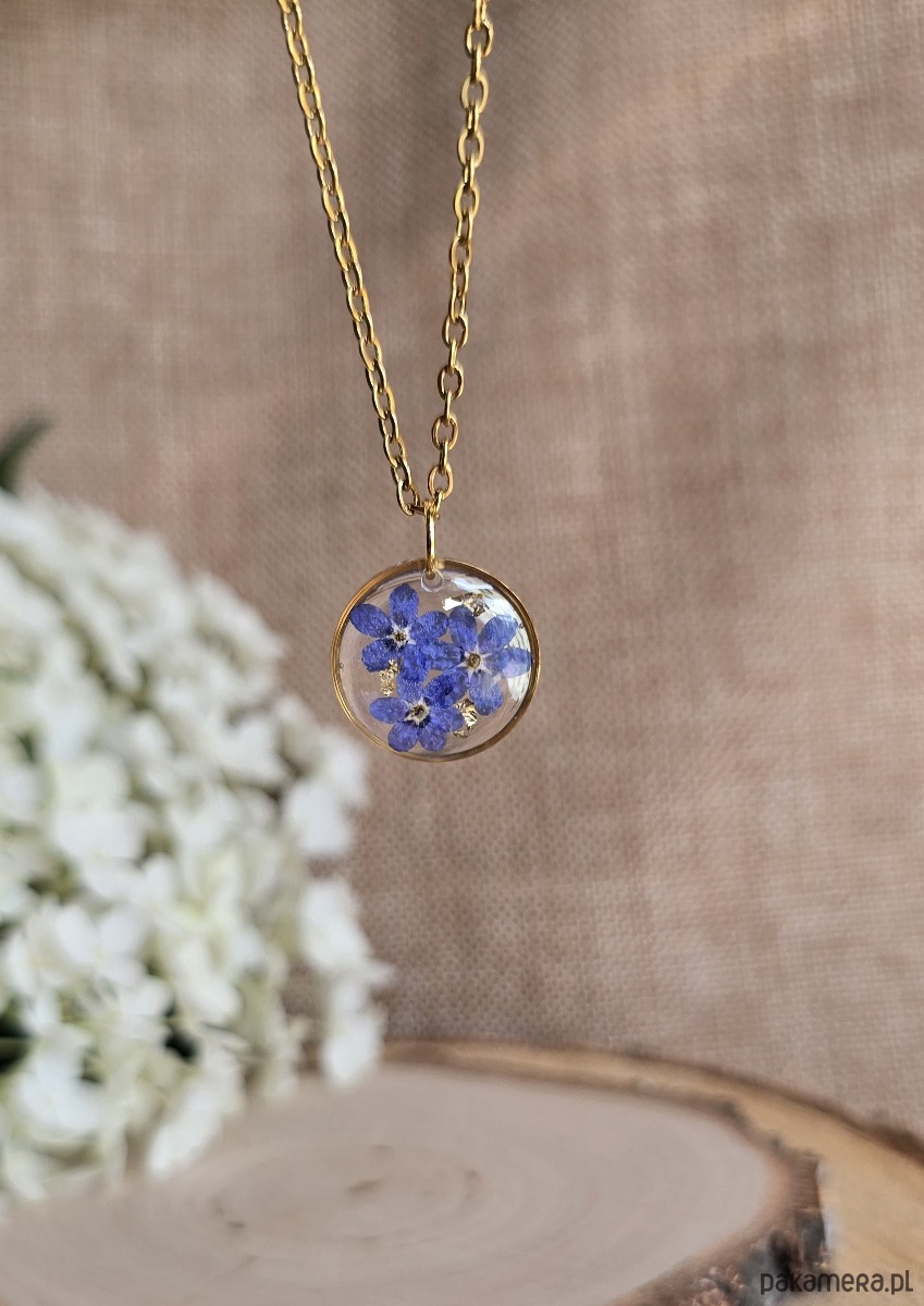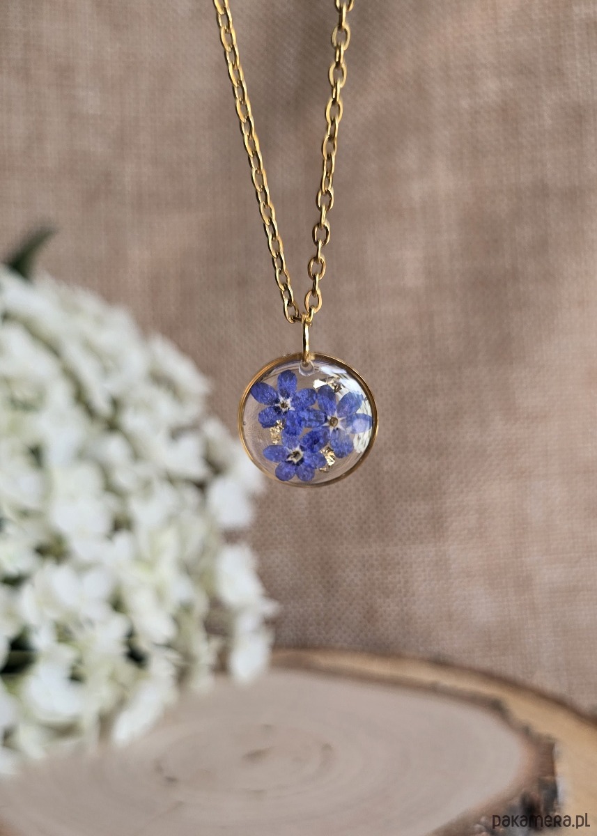 Oferuję Państwu unikalną biżuterię. Zawieszka jest wykonana z suszonych kwiatów i żywicy epoksydowej. Biżuteria jest wspaniałym i oryginalnym prezentem na lata.