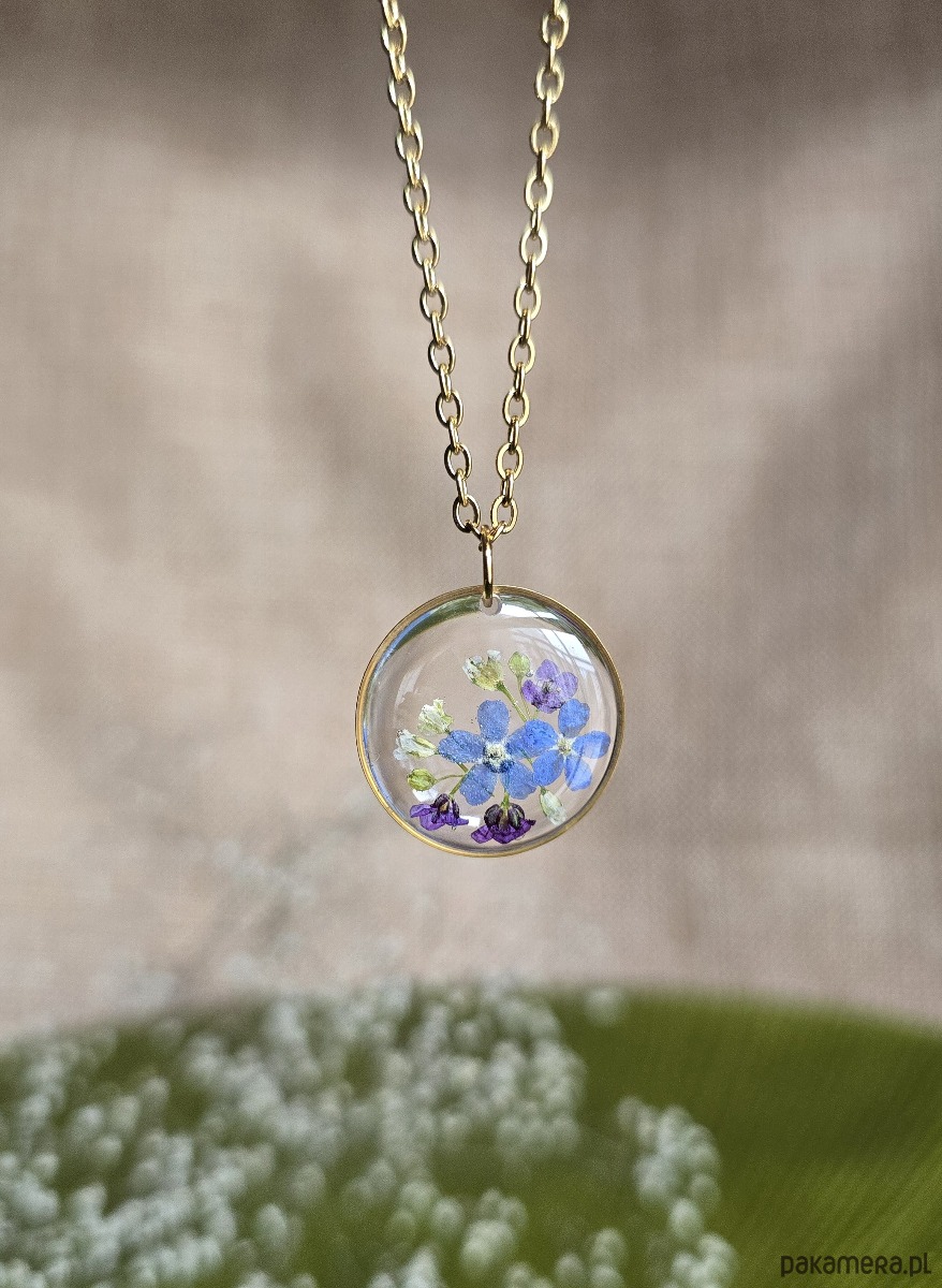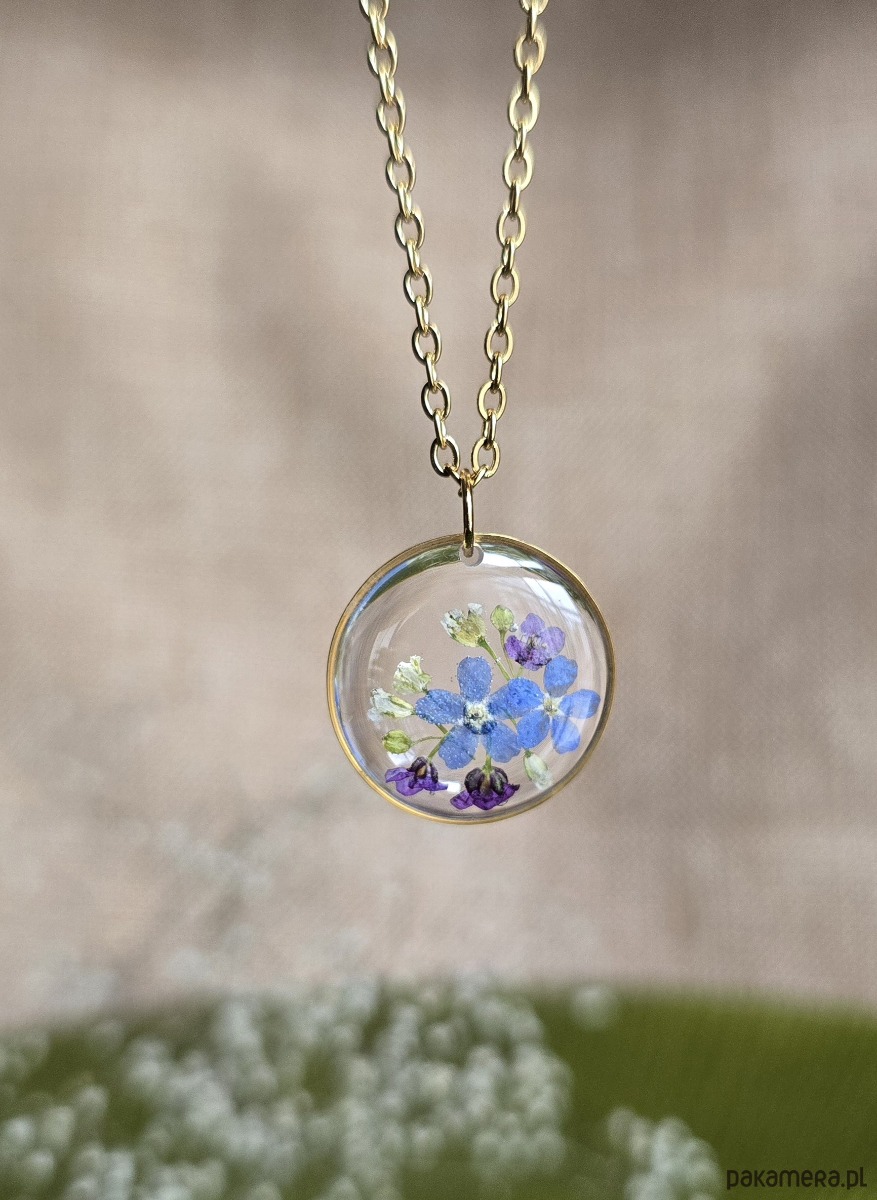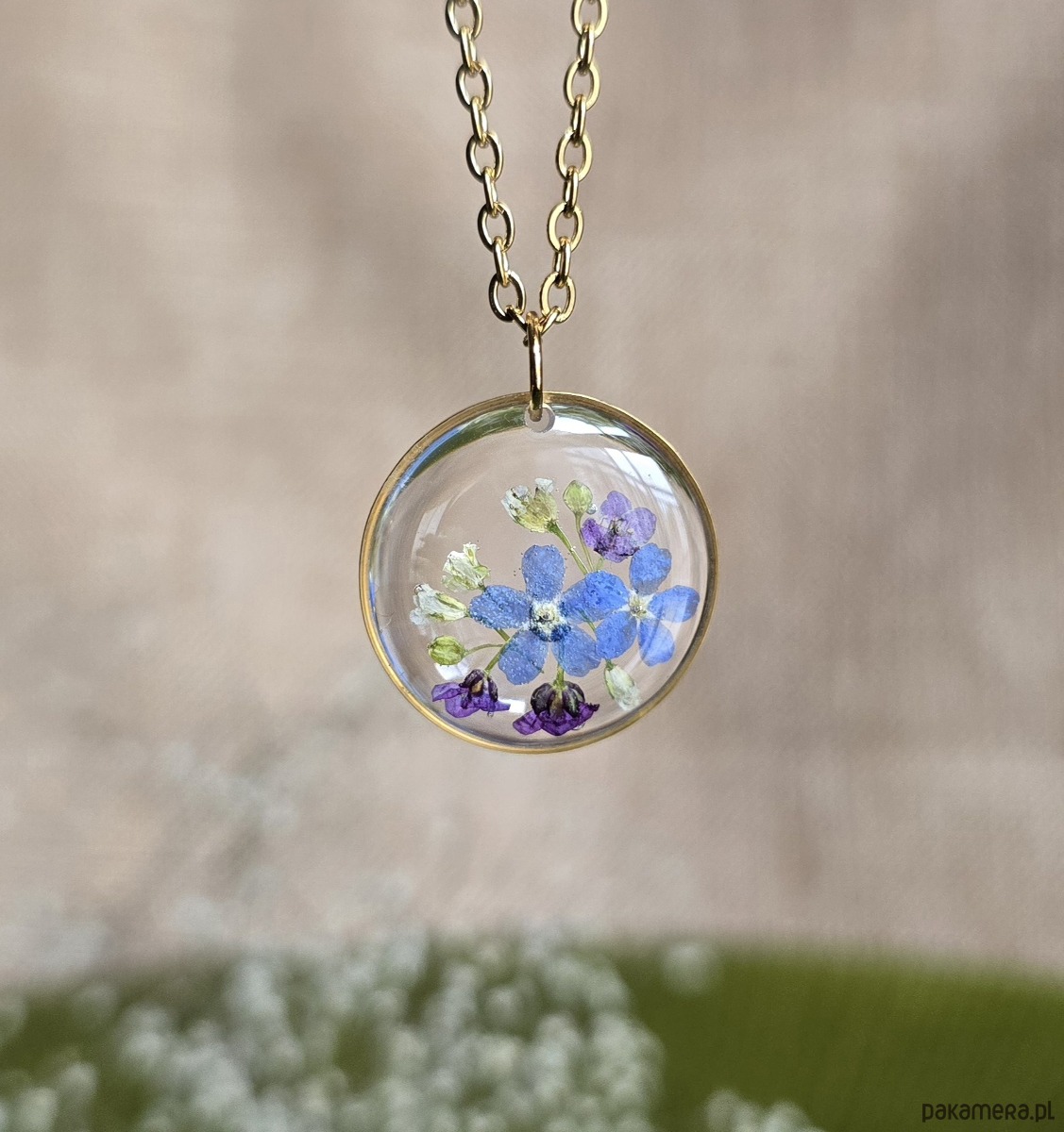Oferuję Państwu unikalną biżuterię. Zawieszka jest wykonana z suszonych kwiatów i żywicy epoksydowej. Biżuteria jest wspaniałym i oryginalnym prezentem na lata.