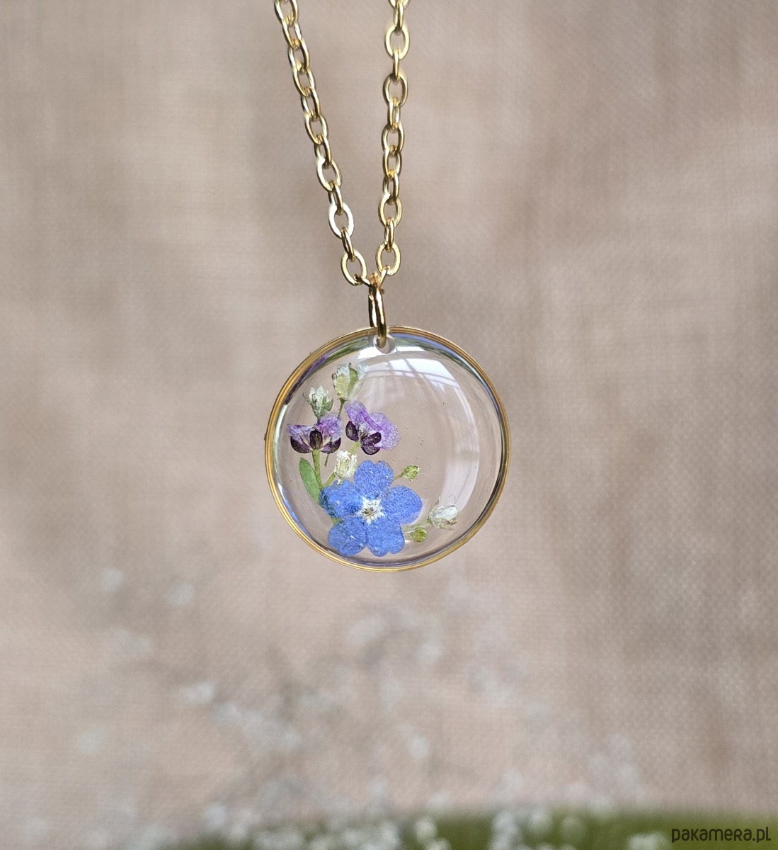 Oferuję Państwu unikalną biżuterię. Zawieszka jest wykonana z suszonych kwiatów i żywicy epoksydowej. Biżuteria jest wspaniałym i oryginalnym prezentem na lata.