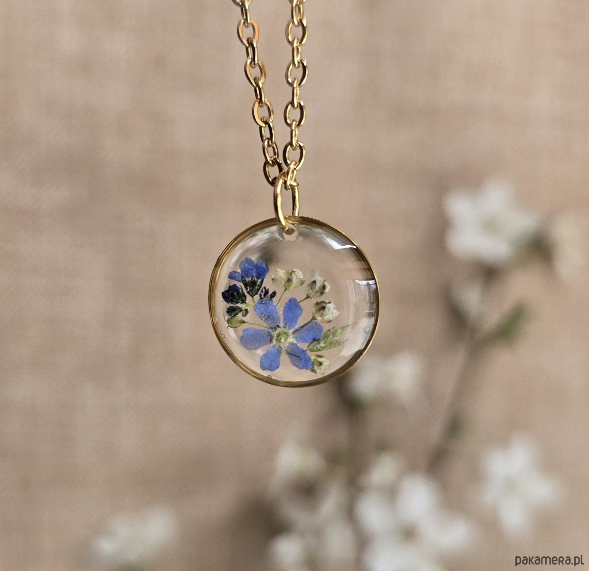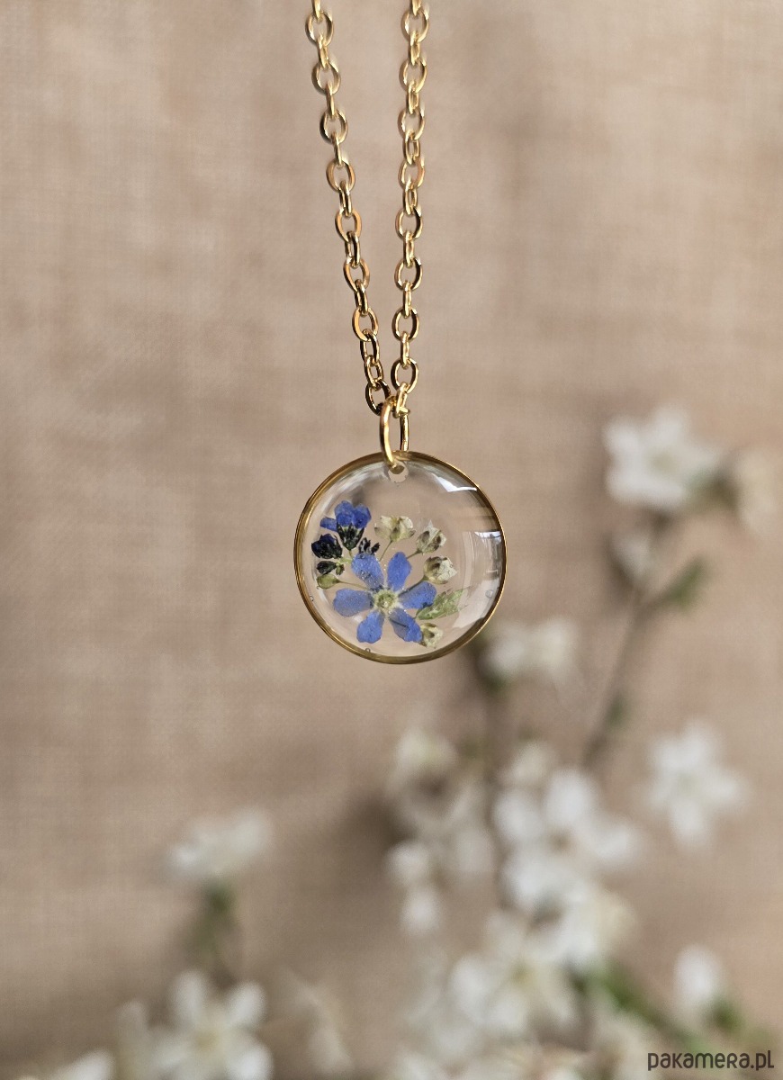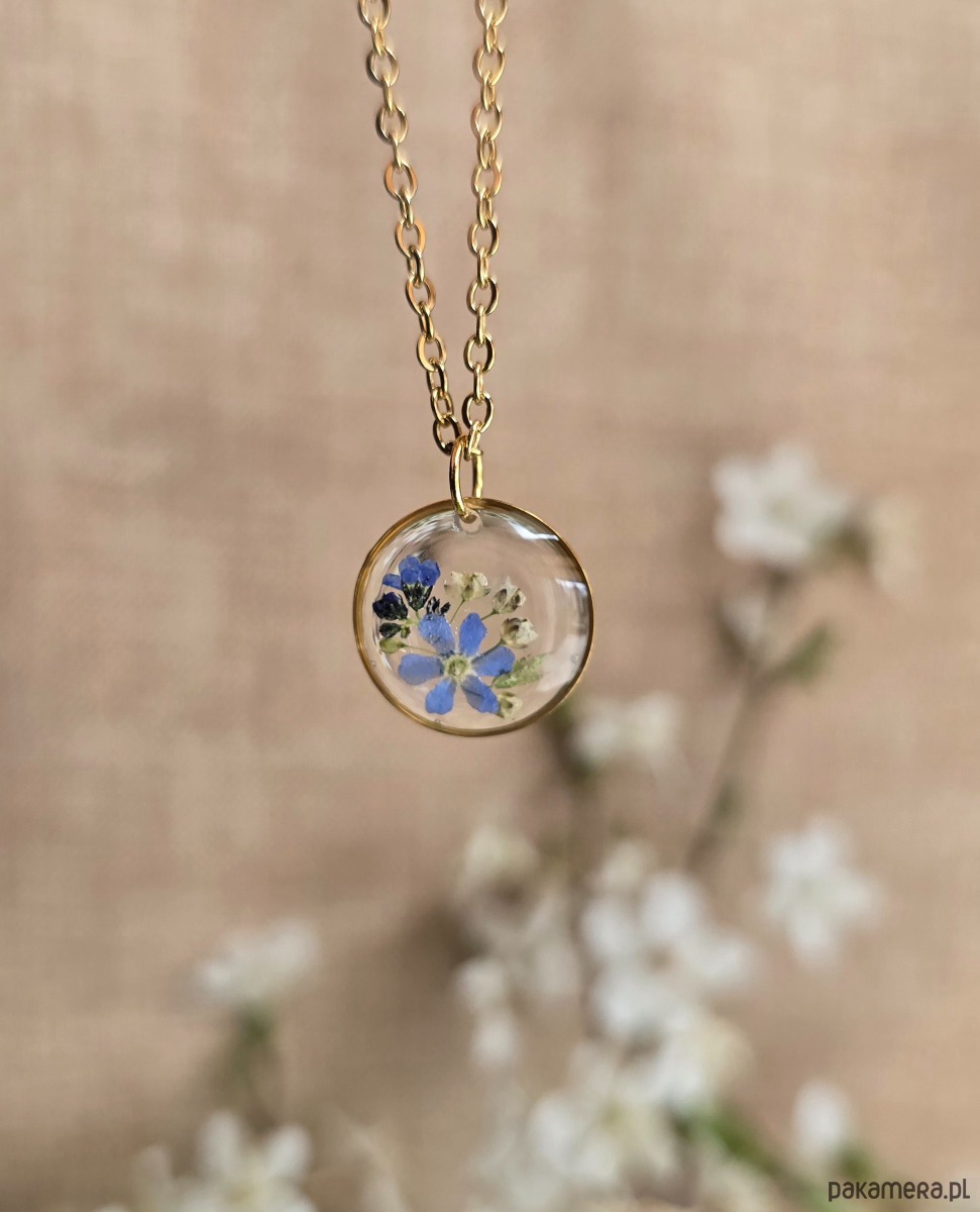 Oferuję Państwu unikalną biżuterię. Zawieszka jest wykonana z suszonych kwiatów i żywicy epoksydowej. Biżuteria jest wspaniałym i oryginalnym prezentem na lata.