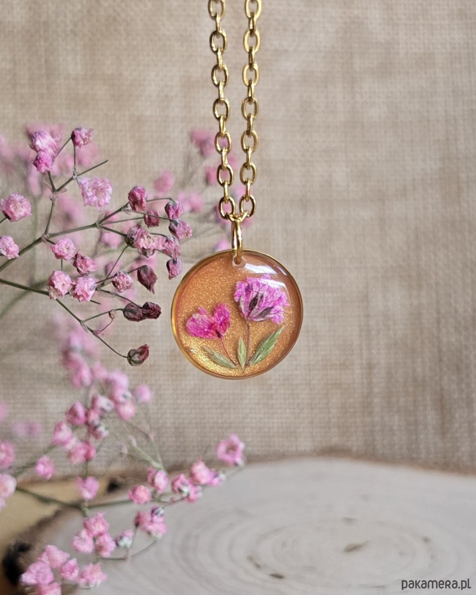 Oferuję Państwu unikalną biżuterię. Zawieszka jest wykonana z suszonych kwiatów i żywicy epoksydowej. Biżuteria jest wspaniałym i oryginalnym prezentem na lata.