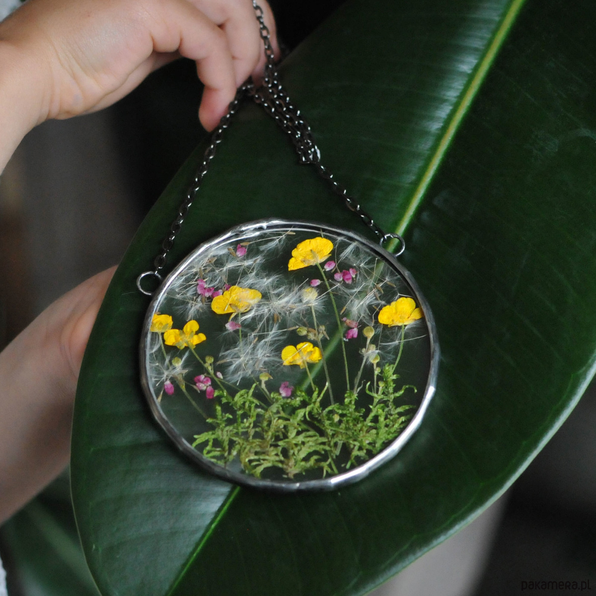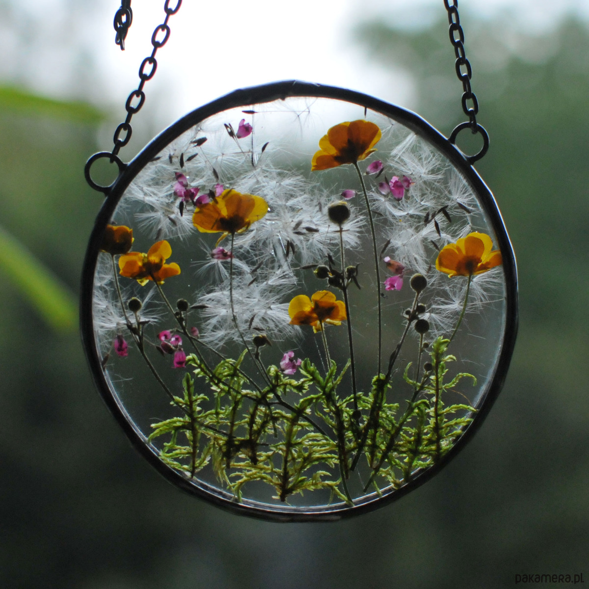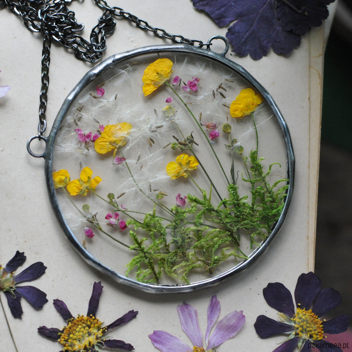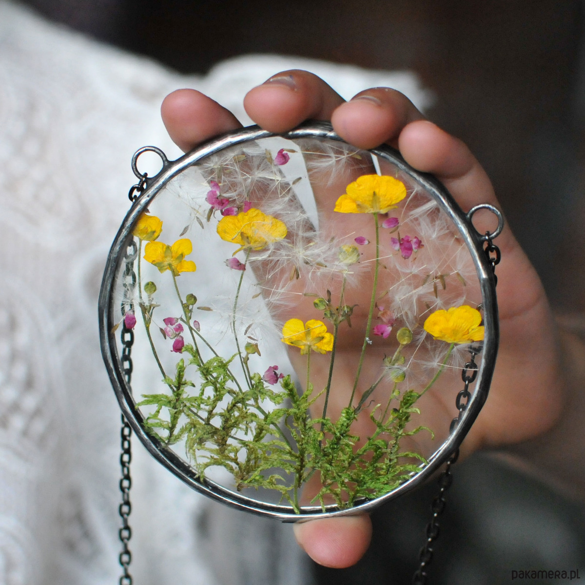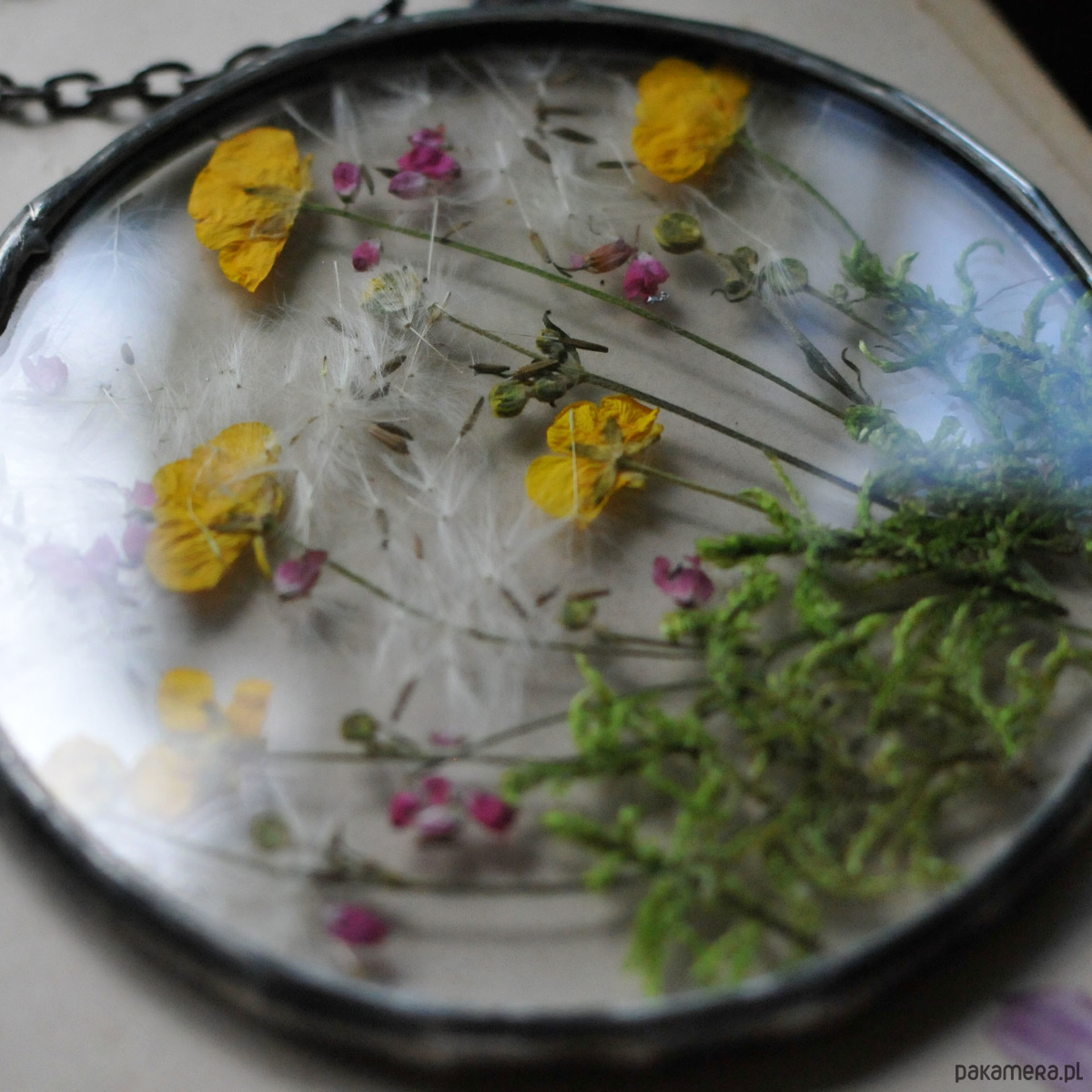 W szkle umieszczone są prawdziwe, suszone kwiaty jaskru, wrzośca oraz dmuchawiec.