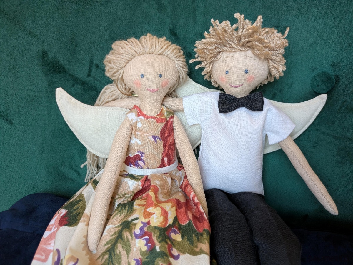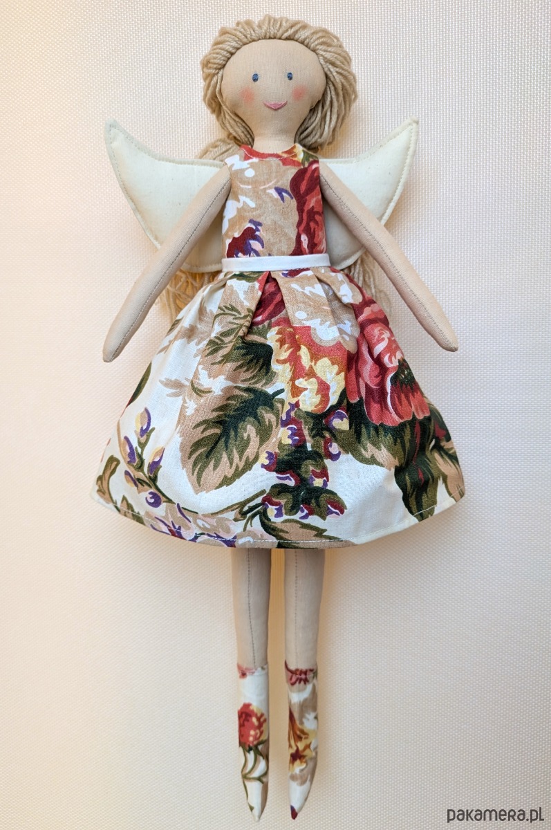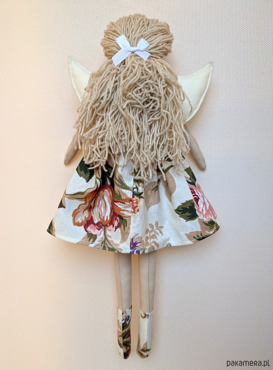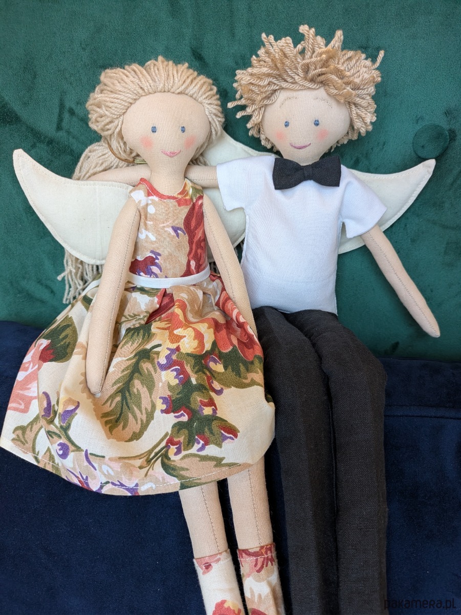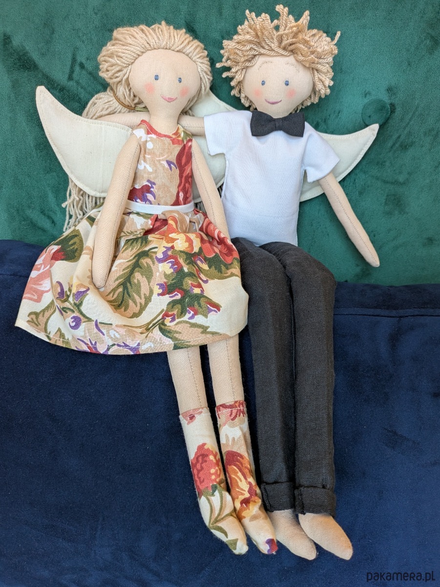 Lalki - anioły to niepowtarzalne rękodzieło dla kolekcjonerów i jednocześnie piękna i wyjątkowa zabawka dla dziecka. Lale są w całości szyte ręcznie w mojej pracowni. Do stworzenia ubranek wykorzystuję fragmenty naturalnych tkanin, pozostałe po szyciu miarowym dla klientek. Ubranka są zdejmowane, a skrzydła przypinane na guziki, można więc bawić się w przebieranie i powiększać garderobę lalek oraz zmieniać fryzury z włóczkowych włosów.