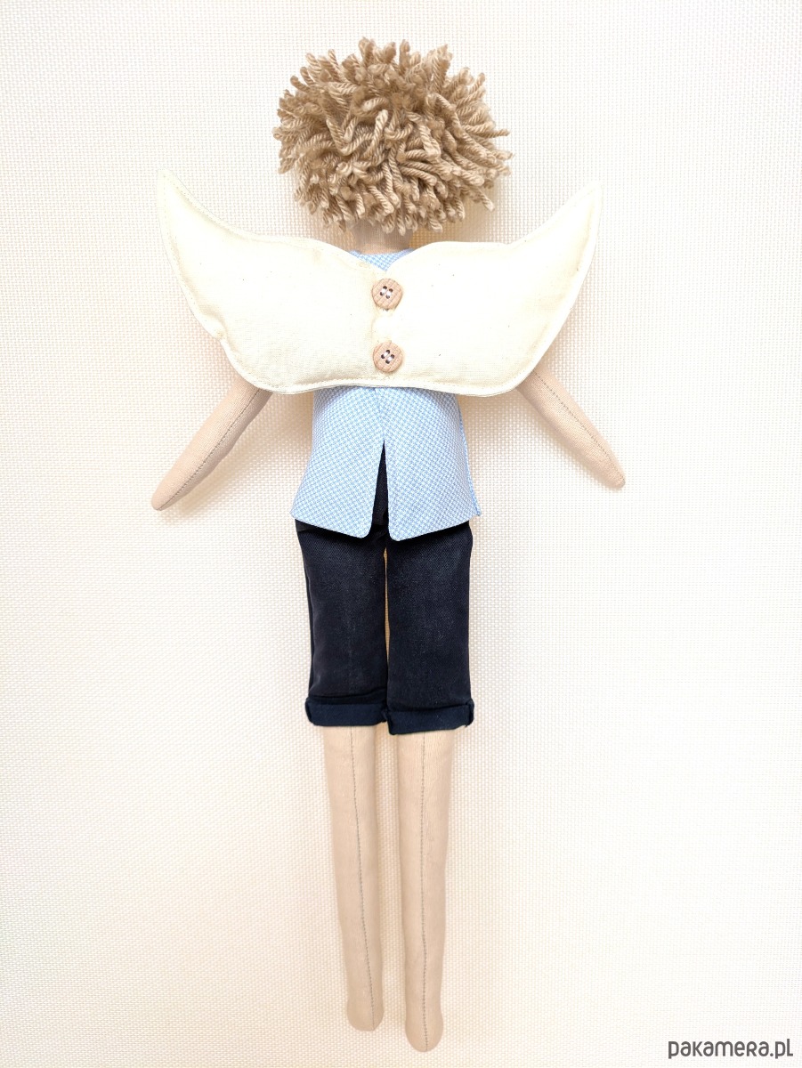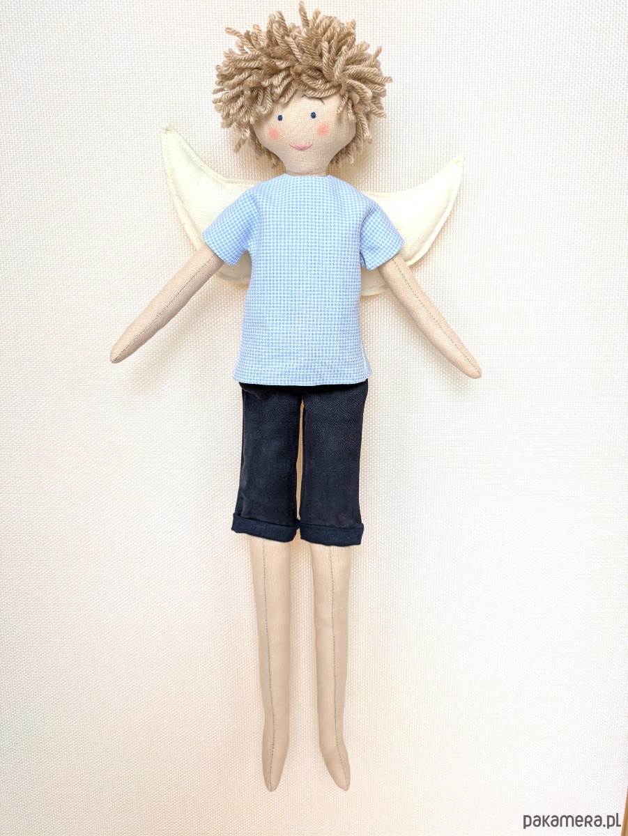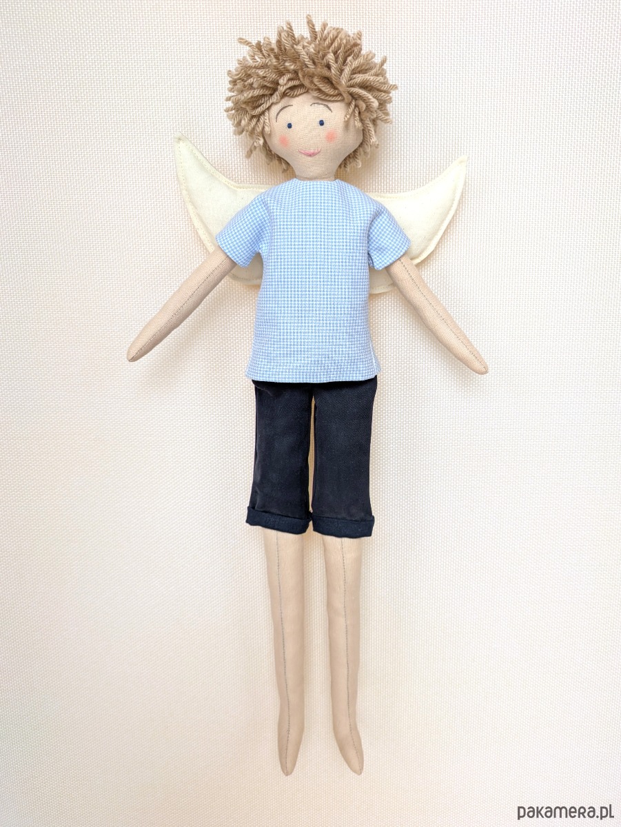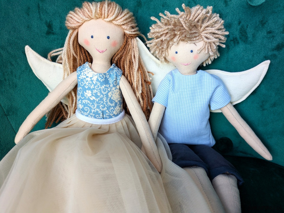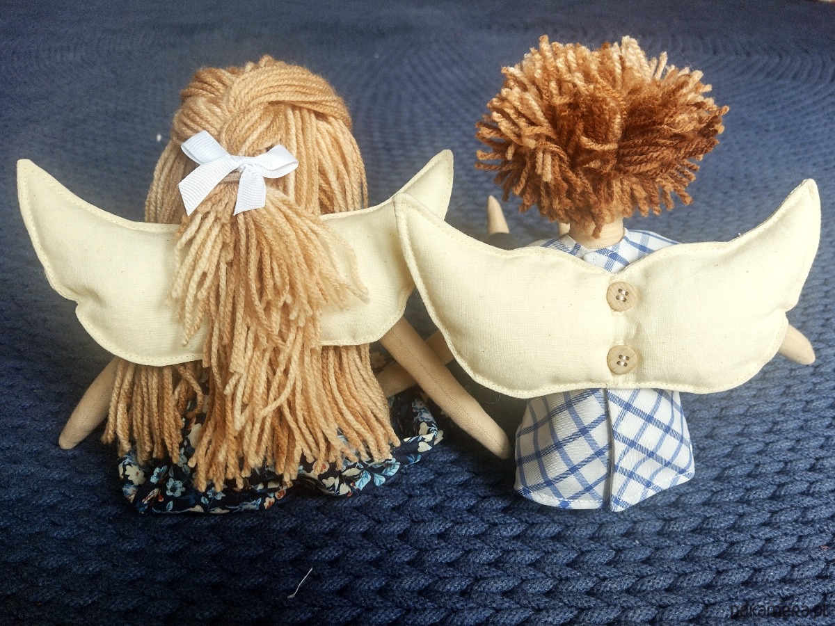 Lalki - anioły to niepowtarzalne rękodzieło dla kolekcjonerów i jednocześnie piękna i wyjątkowa zabawka dla dziecka. Lale są w całości szyte ręcznie w mojej pracowni. Do stworzenia ubranek wykorzystuję fragmenty naturalnych tkanin, pozostałe po szyciu miarowym dla klientek. Ubranka są zdejmowane, a skrzydła przypinane na guziki, można więc bawić się w przebieranie i powiększać garderobę lalek oraz zmieniać fryzury z włóczkowych włosów.