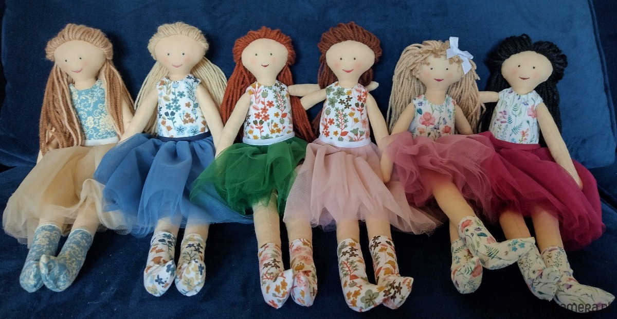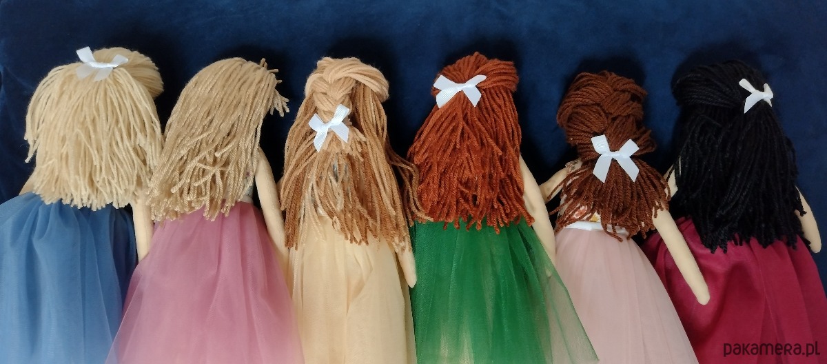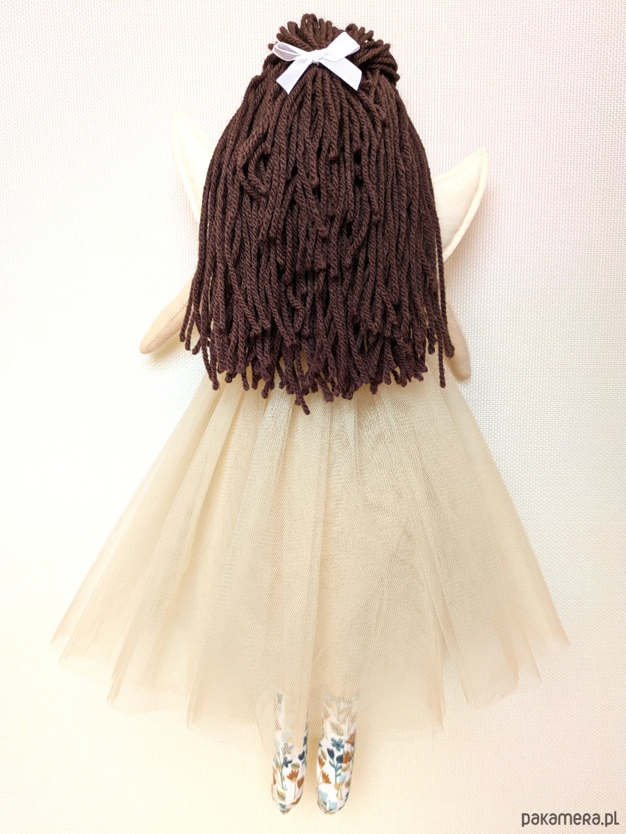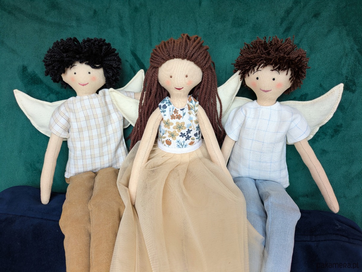 Lalki - anioły to niepowtarzalne rękodzieło dla kolekcjonerów i jednocześnie piękna i wyjątkowa zabawka dla dziecka. Lale są w całości szyte ręcznie w mojej pracowni. Do stworzenia ubranek wykorzystuję fragmenty naturalnych tkanin, pozostałe po szyciu miarowym dla klientek. Ubranka są zdejmowane, a skrzydła przypinane na guziki, można więc bawić się w przebieranie i powiększać garderobę lalek oraz zmieniać fryzury z włóczkowych włosów.