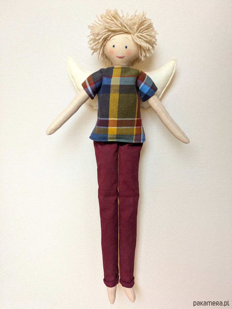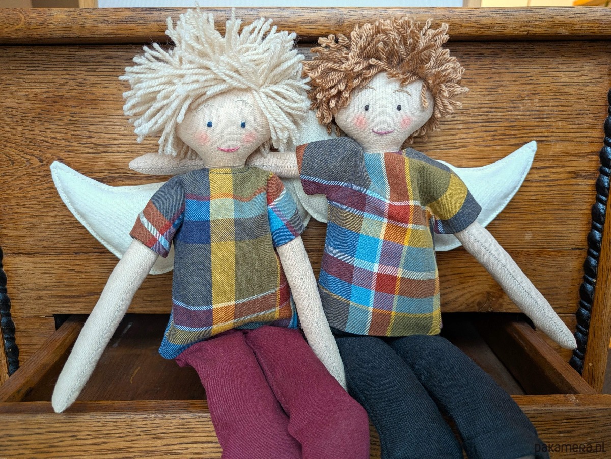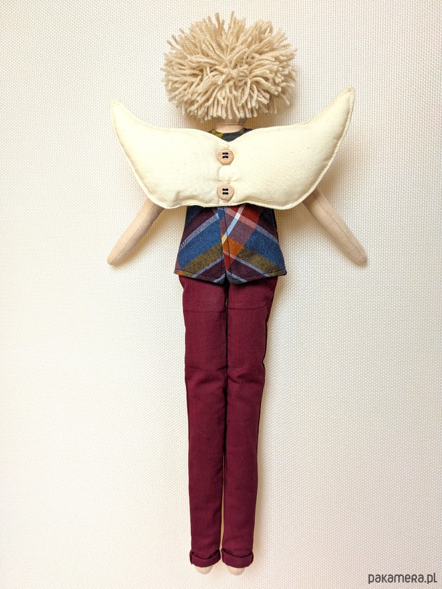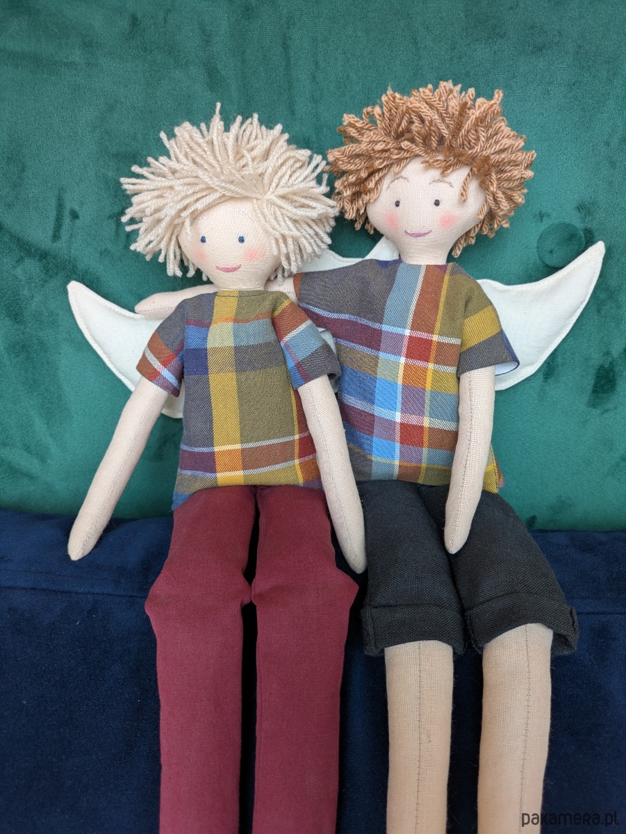 Lalki - anioły to niepowtarzalne rękodzieło dla kolekcjonerów i jednocześnie piękna i wyjątkowa zabawka dla dziecka. Lale są w całości szyte ręcznie w mojej pracowni. Do stworzenia ubranek wykorzystuję fragmenty naturalnych tkanin, pozostałe po szyciu miarowym dla klientek. Ubranka są zdejmowane, a skrzydła przypinane na guziki, można więc bawić się w przebieranie i powiększać garderobę lalek oraz zmieniać fryzury z włóczkowych włosów.