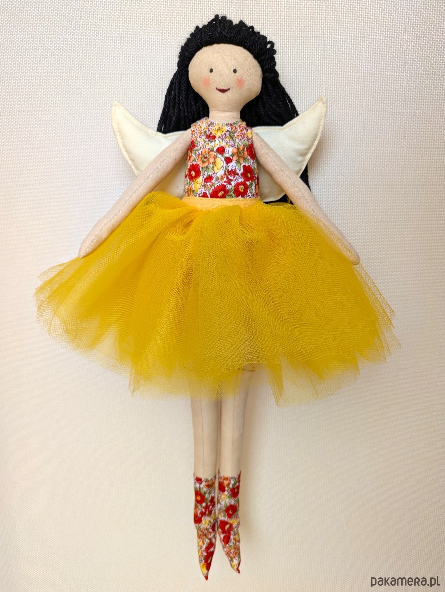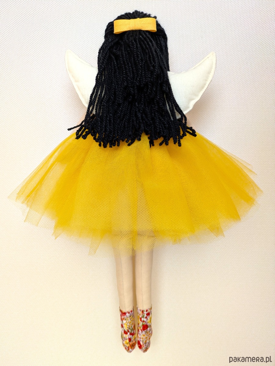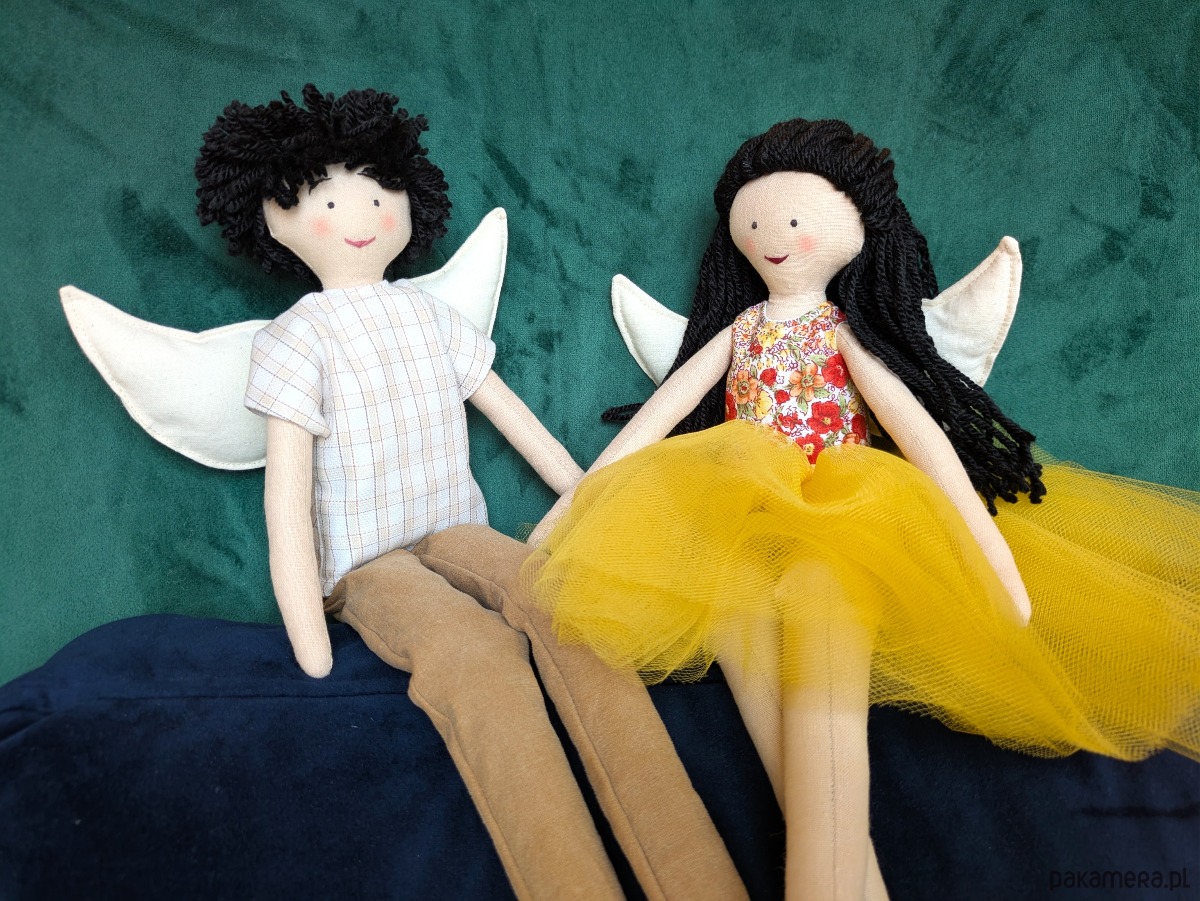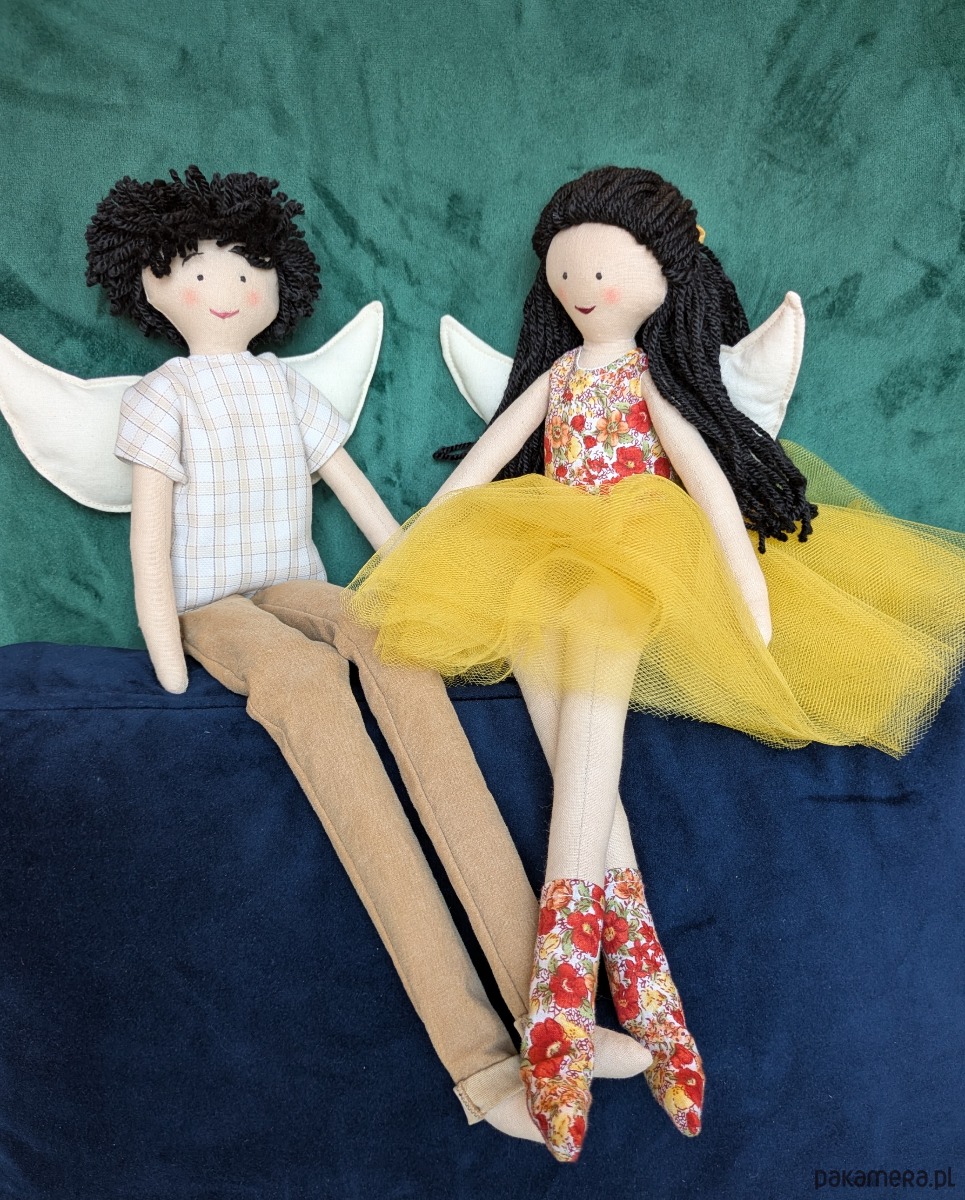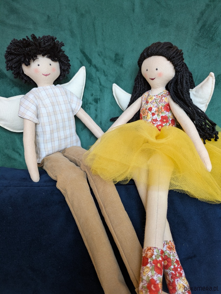Lalki - anioły to niepowtarzalne rękodzieło dla kolekcjonerów i jednocześnie piękna i wyjątkowa zabawka dla dziecka. Lale są w całości szyte ręcznie w mojej pracowni. Do stworzenia ubranek wykorzystuję fragmenty naturalnych tkanin, pozostałe po szyciu miarowym dla klientek. Ubranka są zdejmowane, a skrzydła przypinane na guziki, można więc bawić się w przebieranie i powiększać garderobę lalek oraz zmieniać fryzury z włóczkowych włosów.