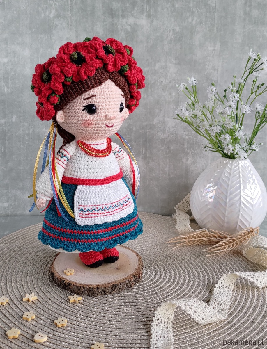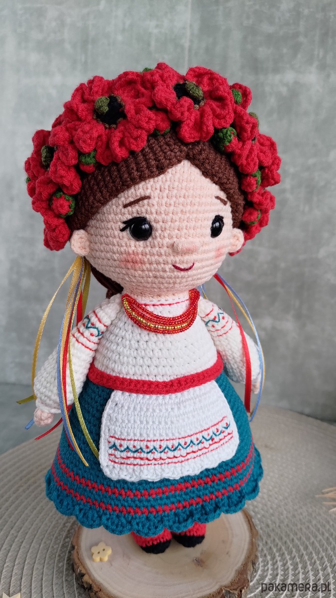 - Lalka na głowie ma wianuszek z kwiatów maku.