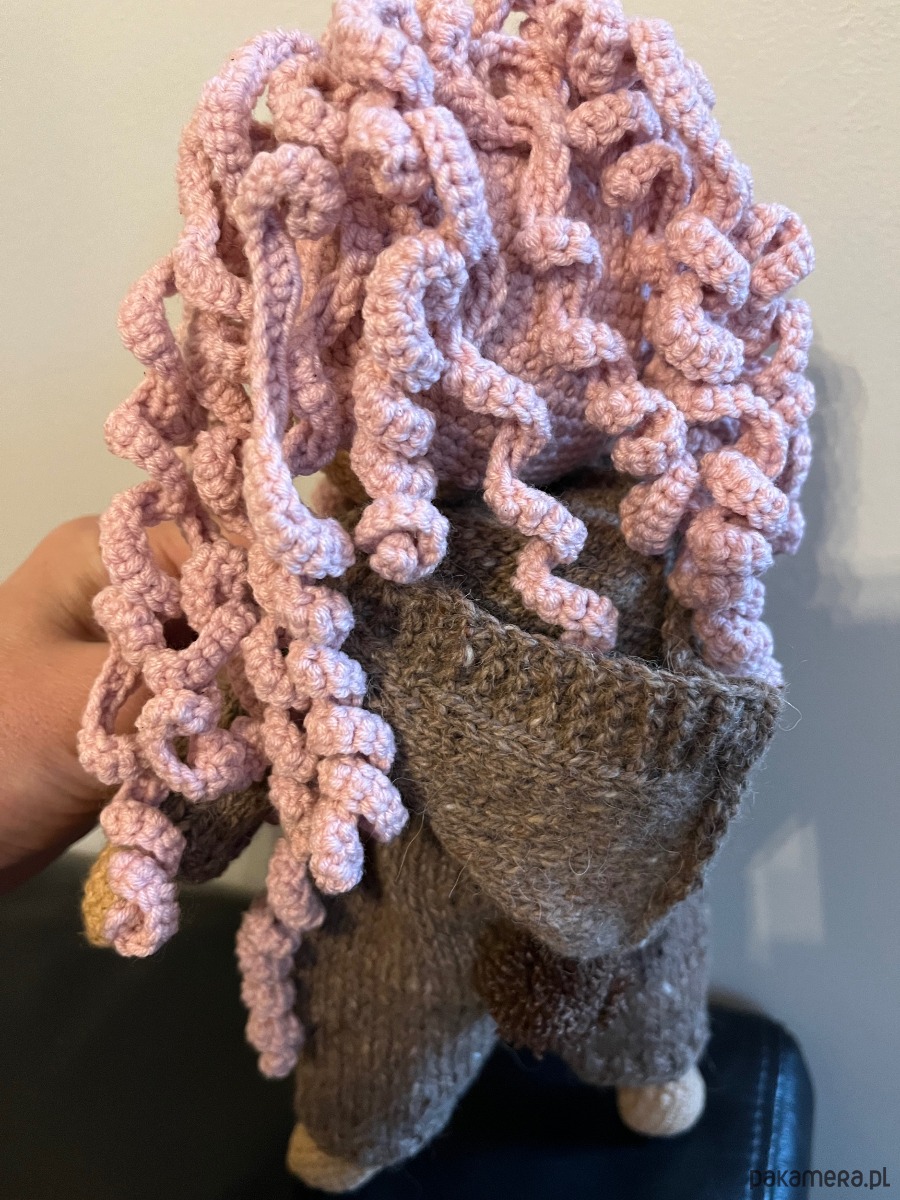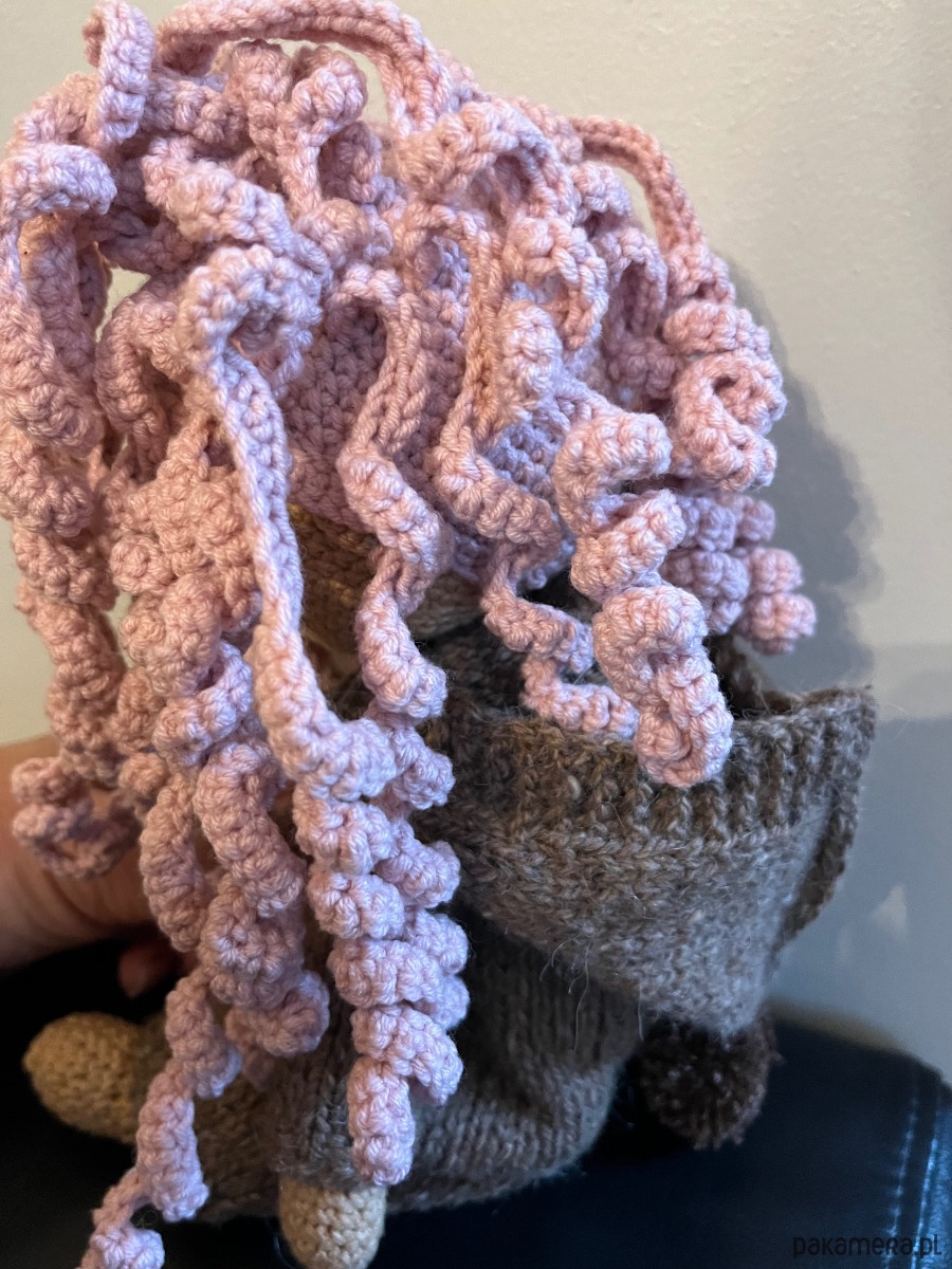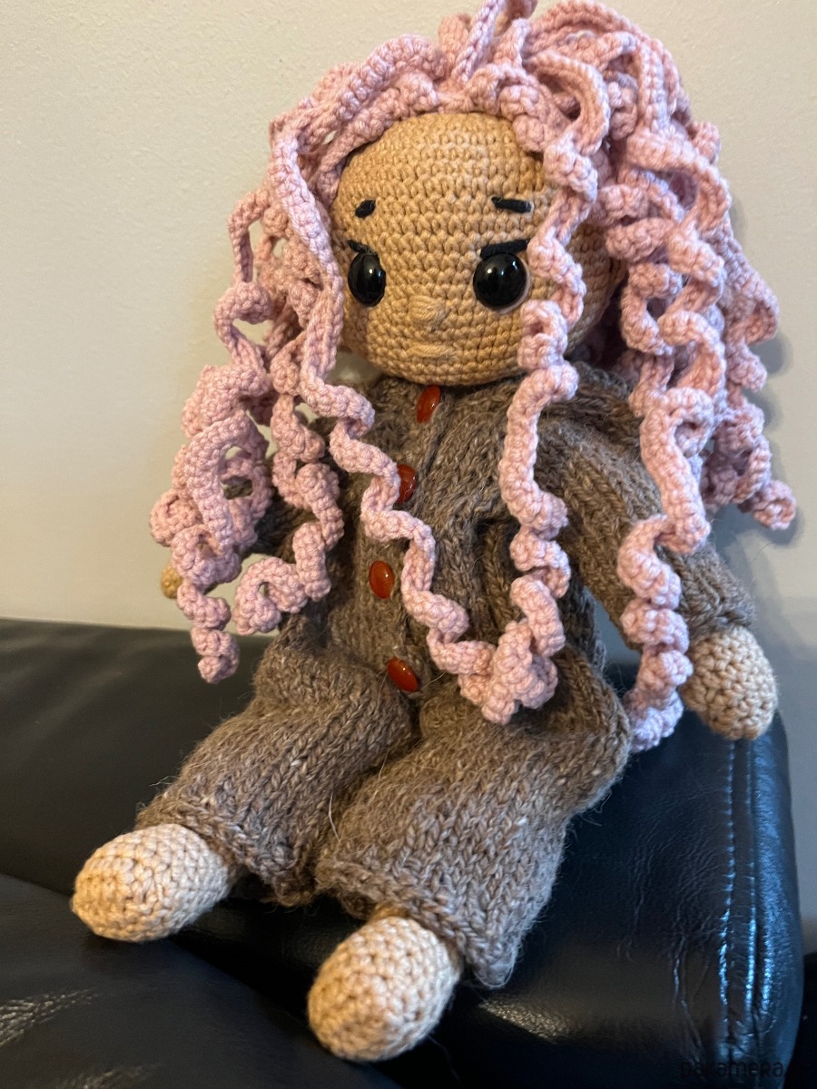 To urocza, ręczne wykonana szydełkowa lalka z dużymi błyszczącymi oczami, burzą różowych kręconych włosów w wełnianym kombinezonie, zapinanym na guziki. Wygląda bardzo starannie i ciepło, jął idealna przytulanka lub dekoracja.