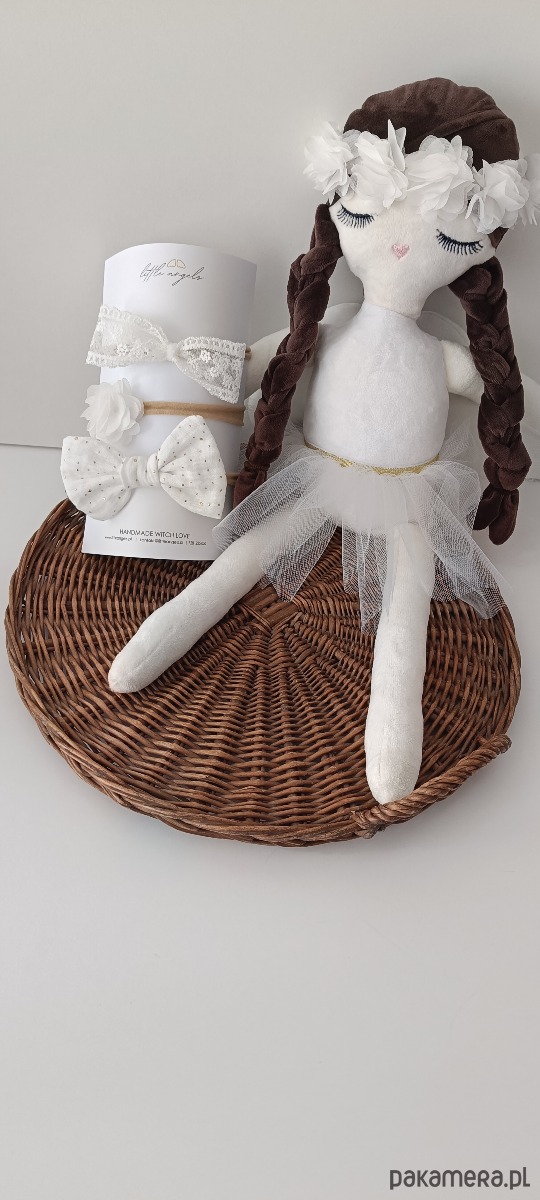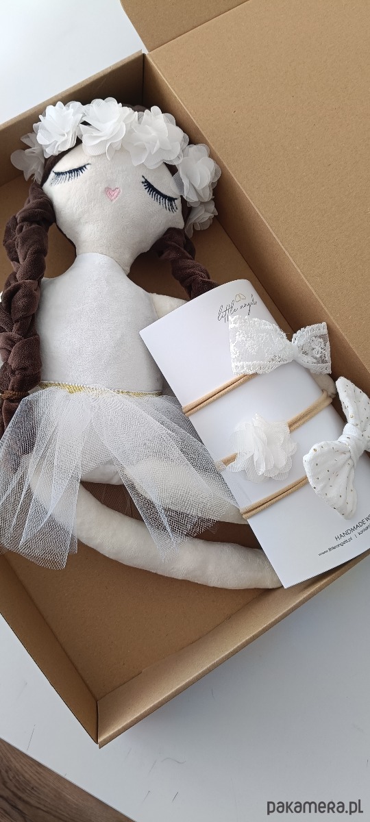 Nasza szmaciana lalka Little Angel może stać się niezwykłą pamiątką z ważnego dnia w życiu dziecka. Będzie piękną ozdobą dziecięcego pokoju. Posiada skrzydełka na których haftujemy imię dziecka lub dowolny krótki napis, ubrana jest w jasną, delikatną, zwiewną spódniczkę, na głowie zaplecione ma dwa warkoczyki. Jej głowę ozdabiamy wiankiem, kokardką lub aureolą. Może mieć otwarte lub zamknięta oczka. To nie jest zwykła lalka - to aniołek czuwający nad dzieckiem:) Lalę pakujemy w kartonik na którym umieszczamy dowolną dedykację.