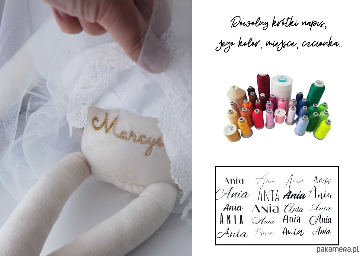 Personalizowana lala ok 40-45 cm) wykonywana na zamówienie dzięki czemu jej wygląd możemy dowolnie modyfikować tak aby pasowała do osoby do której ma trafić. Dodatkowo na lalce ożemy wyhaftowac dowolny krótki napis np imię
