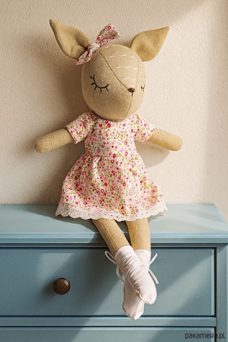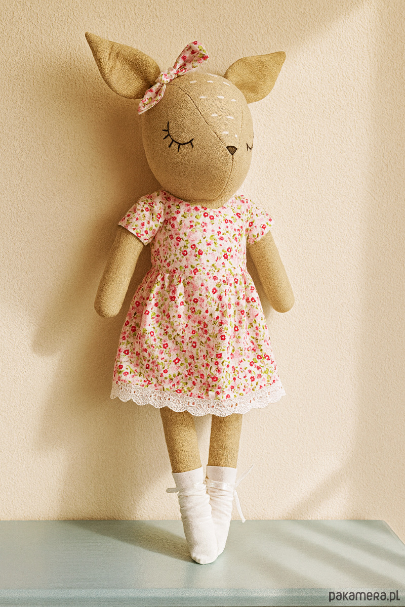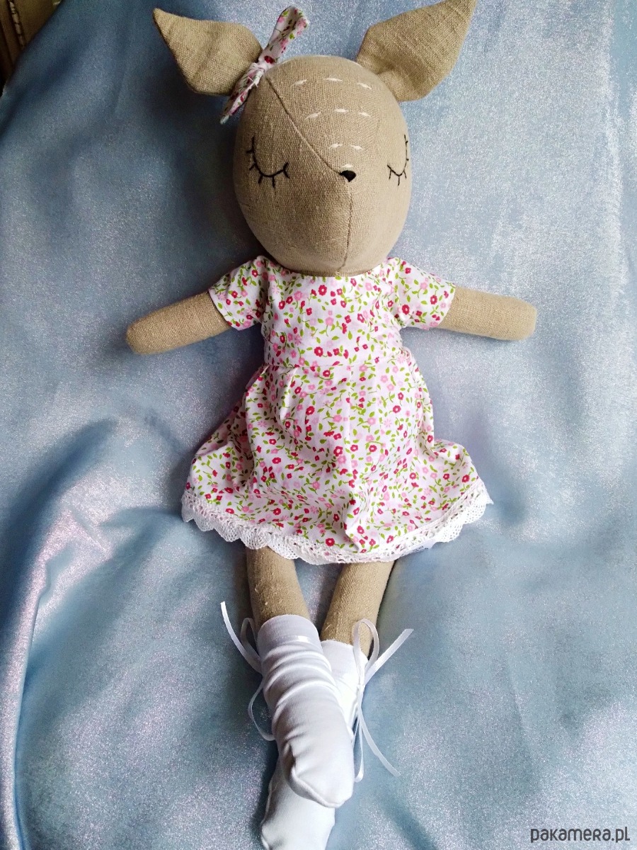 Piękna, ręcznie uszyta lalka sarenka w uroczej kwiecistej sukience, która dodaje jej jeszcze więcej uroku!