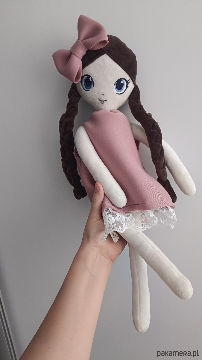 Szukasz wyjątkowego prezentu dla małej dziewczynki na narodziny, chrzest, urodziny, święta, dzień dziecka ? Prezentowana lala będzie piękną pamiątką, ozdobą🥰 Ma 57 cm wzrostu. Wykonana z bardzo miłej w dotyku tkaniny minky. Wypchana antyalergicznym puchem. Na lalce haftujemy imię dziecka w ustalonej czcionce i kolorze. Szyta jest na zamówienie i może być dowolnie modyfikowana, tak aby pasowała do dziecka, do którego ma trafić.