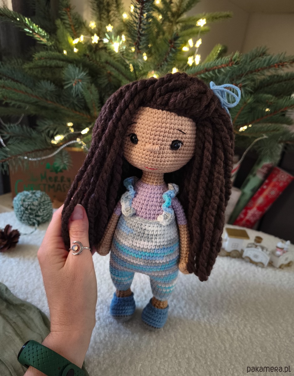 - Włosy w kolorze ciemnej czekolady wykonane są z wysokiej jakości włóczki (30% alpaka, 10% wełna, 60% akryl), ale pozostają bardzo miękkie — nie drapią, nie gryzą i nie skrzypią.