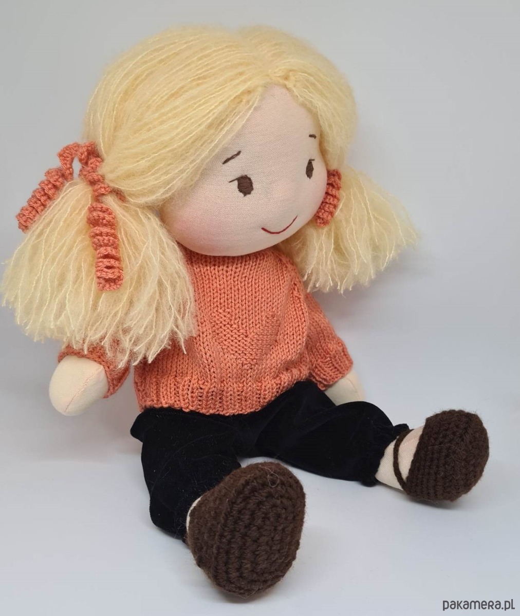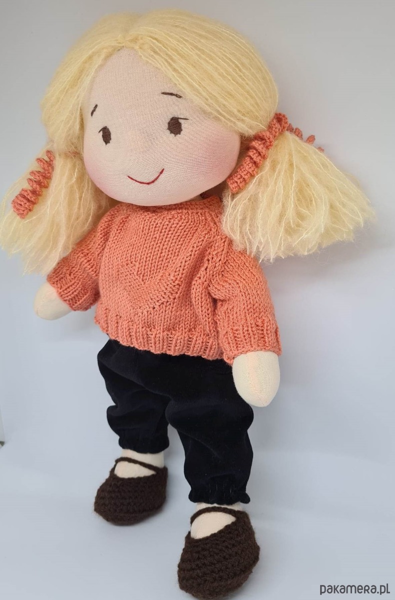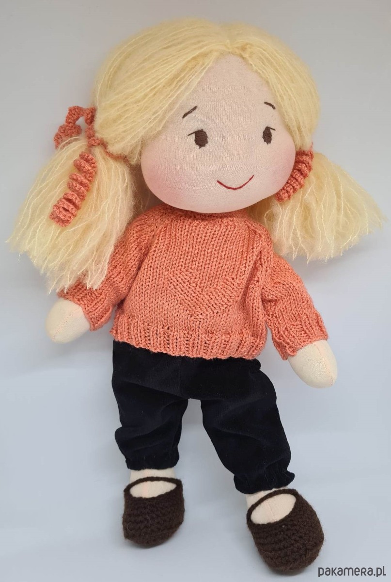 Lalka Zuzia wykonana jest z dzianiny elastycznej dla lalek z certyfikatem OEKO-TEX 100, wypełnienia silikonowego, gąbki i przędzy czesankowej do modelowania twarzy.