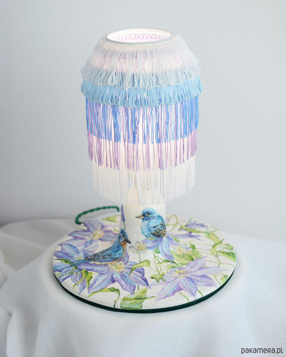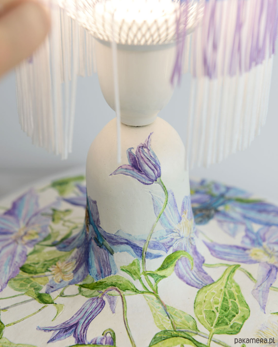 Materiał: Wykonana z suchej gliny, malowana techniką mieszaną, pokryta półmatowym lakierem. Zawiera lampę LED, ceramiczny gwint E27, metalowy klosz w białym kolorze ozdobiony frędzlami w odcieniach białego, fioletowego, purpurowego i niebieskiego, tekstylny przewód pleciony oraz aksamitną podstawę.
